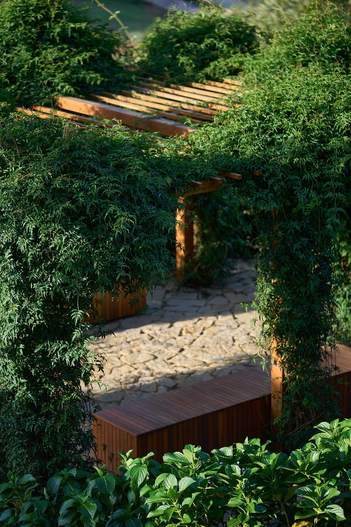 Os caminhos do jardim se desenrolam de forma sinuosa, ladeados por lantanas perfumadas que atraem borboletas e a abelha Jataí, nativa do Brasil. Pequenas áreas de descanso convidam à contemplação, como um redário cercado por lavandas, que exala um aroma envolvente. Um pomar com jabuticabeiras, pitangueiras, mini pitangas e amoreiras convida à interação: cada árvore é identificada com plaquinhas, aproximando os moradores da flora local.