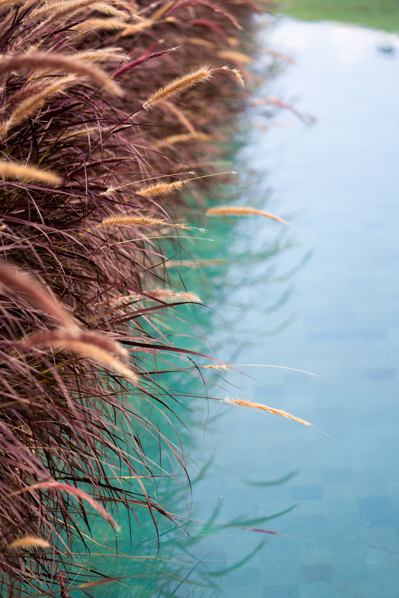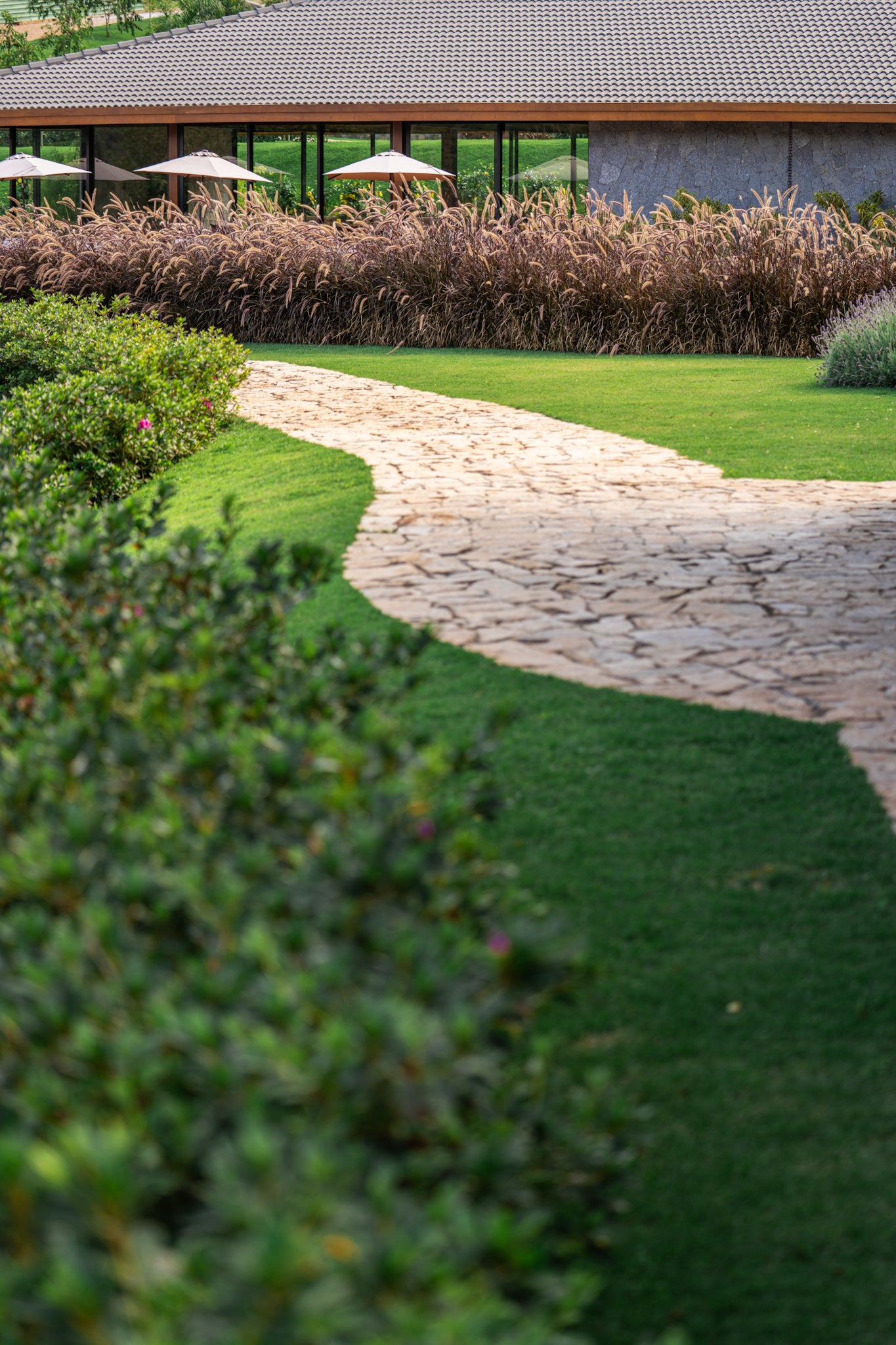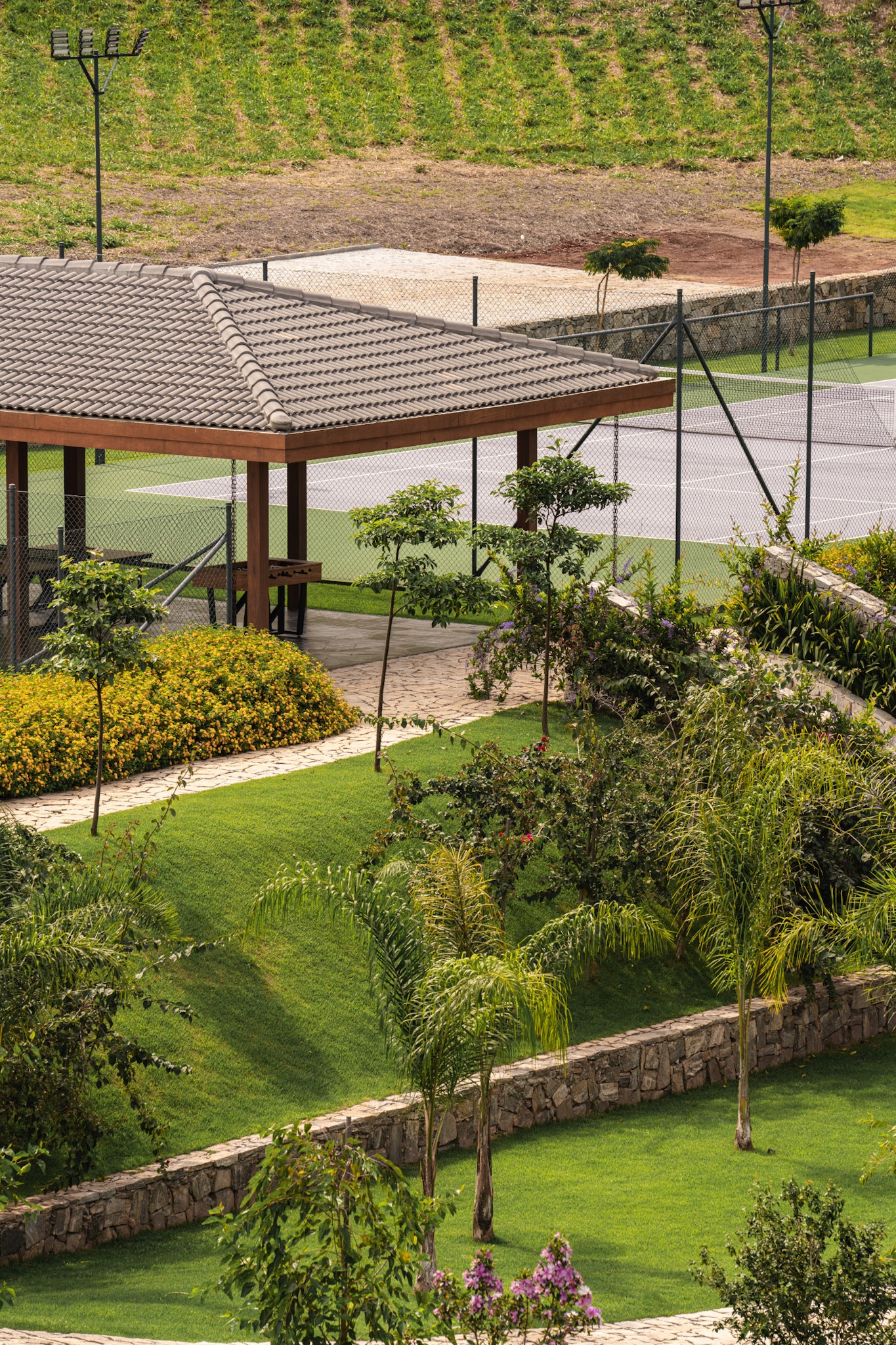 A paleta de cores do condomínio — tons de roxo, rosa, berinjela e lilás — foi traduzida em espécies como manacá-de-cheiro, quaresmeira, bougainville, sete-léguas, manacá-da-serra, agapanto e, em menor escala, capim-do-Texas e hamamelis. A escolha privilegia plantas nativas, garantindo adaptação ao clima local e preservando a biodiversidade.