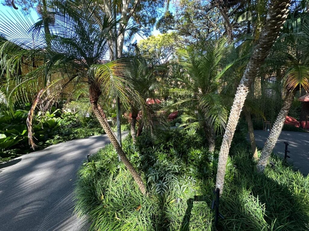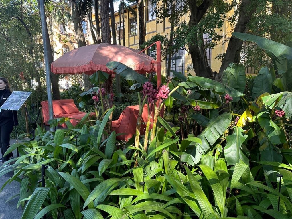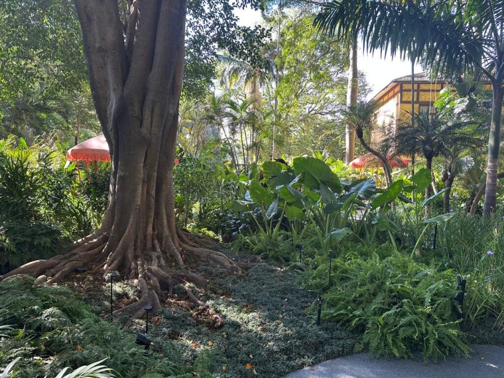 Mais do que um jardim, o ambiente é uma imersão sensorial. O projeto traz uma composição rica de espécies tropicais — como filodendros, antúrios, palmeiras, bromélias e samambaias — que criam uma atmosfera de floresta urbana, acolhedora e instigante. O som da água, o frescor das folhas e a textura dos materiais naturais reforçam a ideia de pausa, de respiro, de reconexão com o essencial.