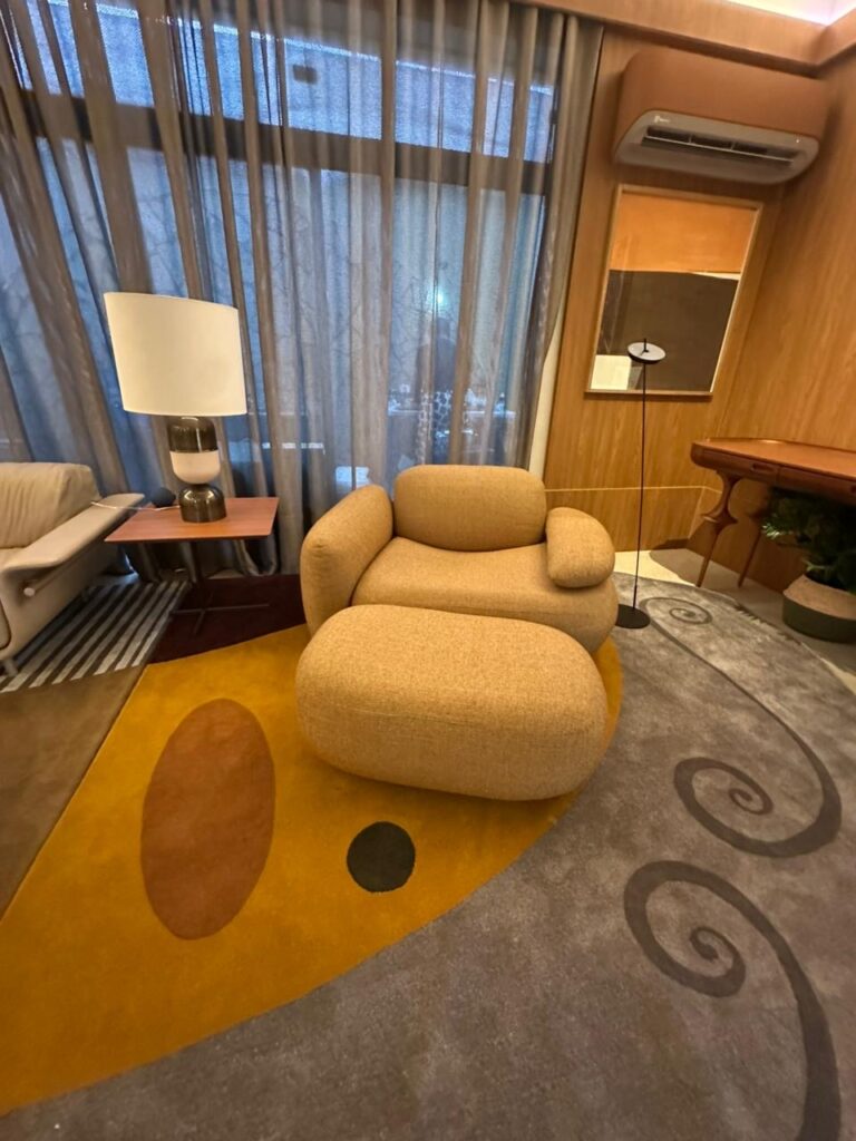 A atmosfera do ambiente se constrói a partir da harmonia entre texturas, luz e mobiliário autoral. As formas são suaves, envolventes, quase como um abraço, e a paleta de cores percorre tons serenos e terrosos, transmitindo calma e equilíbrio. Cada peça foi escolhida para somar à narrativa sensorial proposta por Paola, onde o design deixa de ser apenas funcional e se torna extensão do afeto. A iluminação, cuidadosamente desenhada, reforça essa intenção ao criar pontos de intimidade e respiro, como se cada feixe de luz fosse também um convite à contemplação.