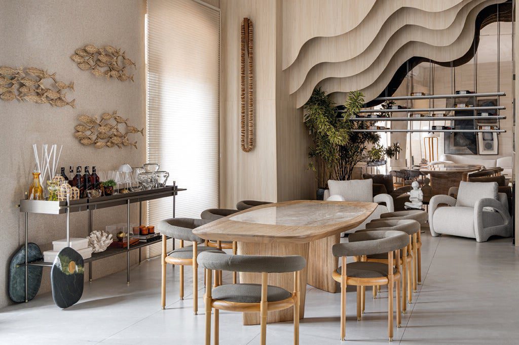 Revestimentos naturais, mobiliário com ondulações e detalhes inspirados nas paisagens litorâneas finalizam a composição, fazendo do Living Praiano dos Sonhos um convite a viver com leveza, elegância e conexão com o mar.