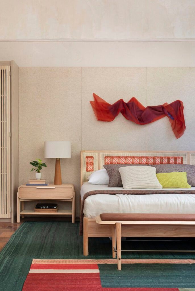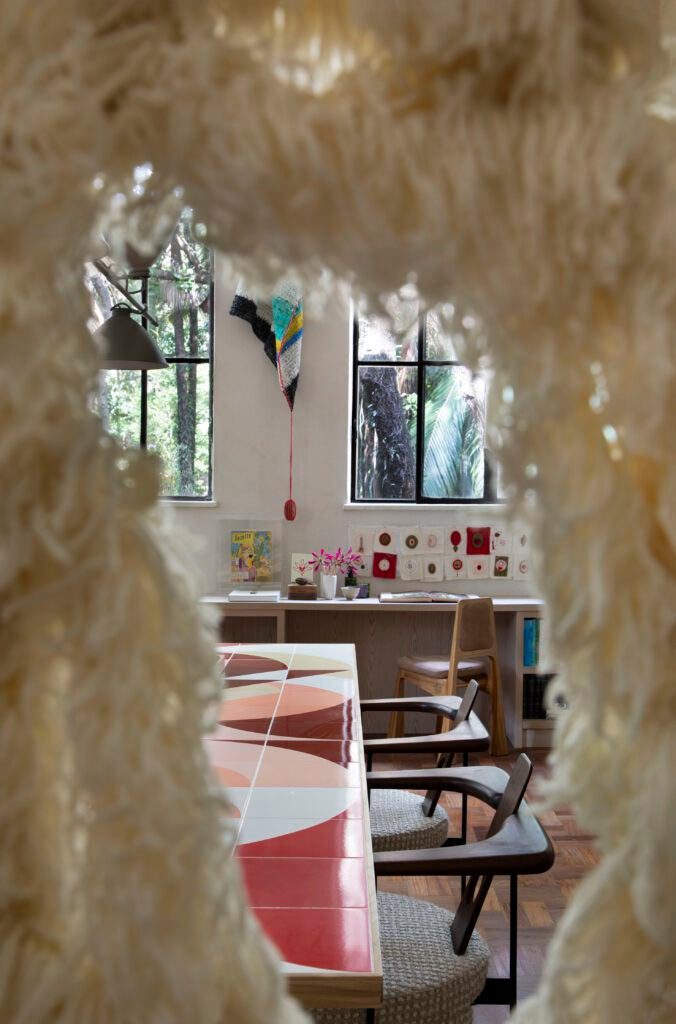A curadoria de arte têxtil é um dos destaques: organdis tingidos por Ysabel de Maisonneuve, tramas de Ana Vaz, cerâmicas do Studio Api e obras que costuram tempo, memória e identidade. A iluminação da +Led valoriza cada textura, enquanto o paisagismo de Bia Abreu e o jardim vertical da Freedom Walls trazem frescor e vida.