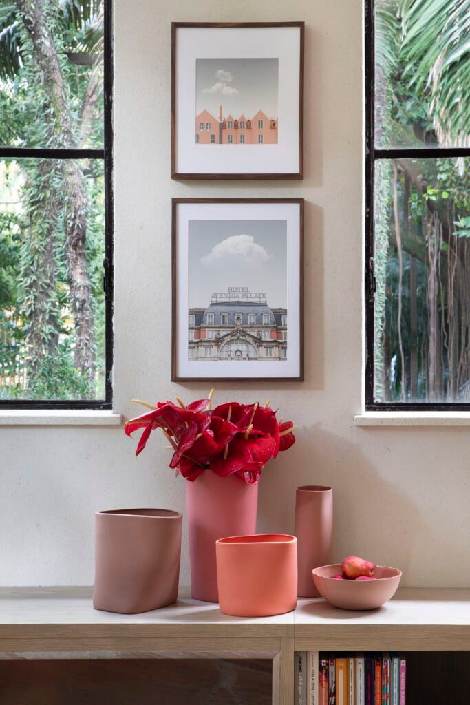 A paleta, guiada pelos tons do amanhecer, aparece em superfícies como o mármore rosa da cozinha e nos tecidos artesanais. O banheiro, posicionado como saída do loft, propõe uma experiência imersiva, com iluminação que simula o ciclo do dia.
