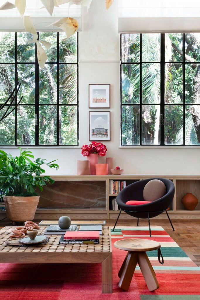 As janelas emolduram a vista para o Parque da Água Branca, filtrada por cortinas romanas da Uniflex Jardins, que deixam a luz natural desenhar sombras e reflexos ao longo do dia.
