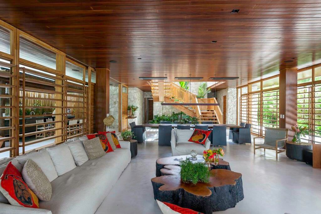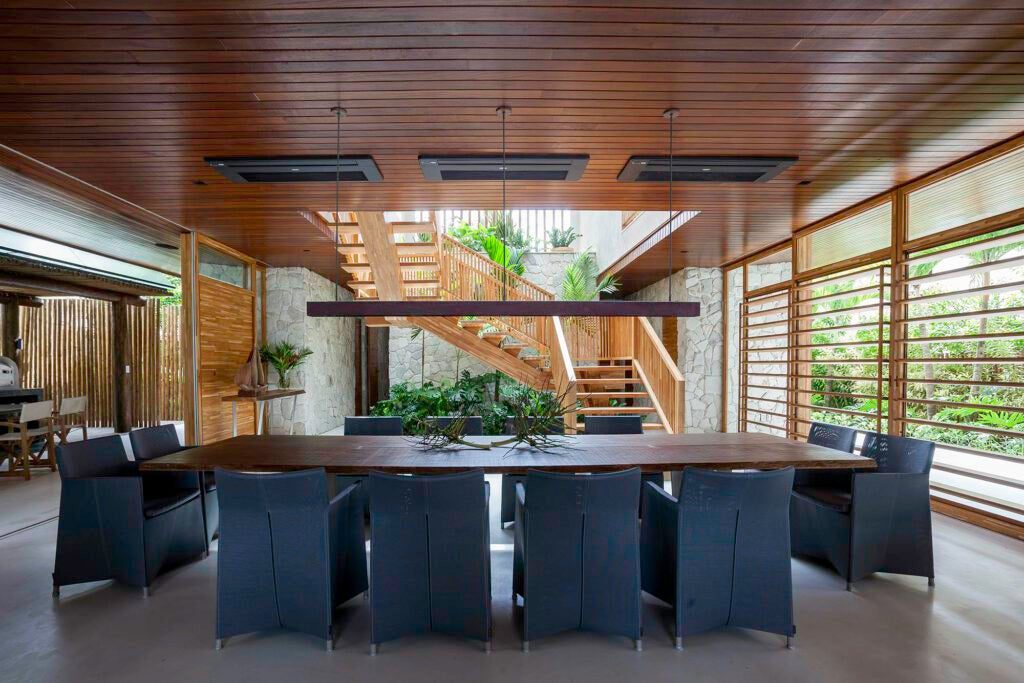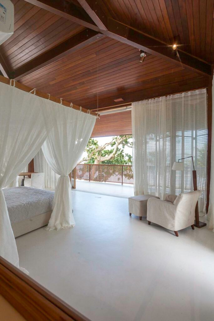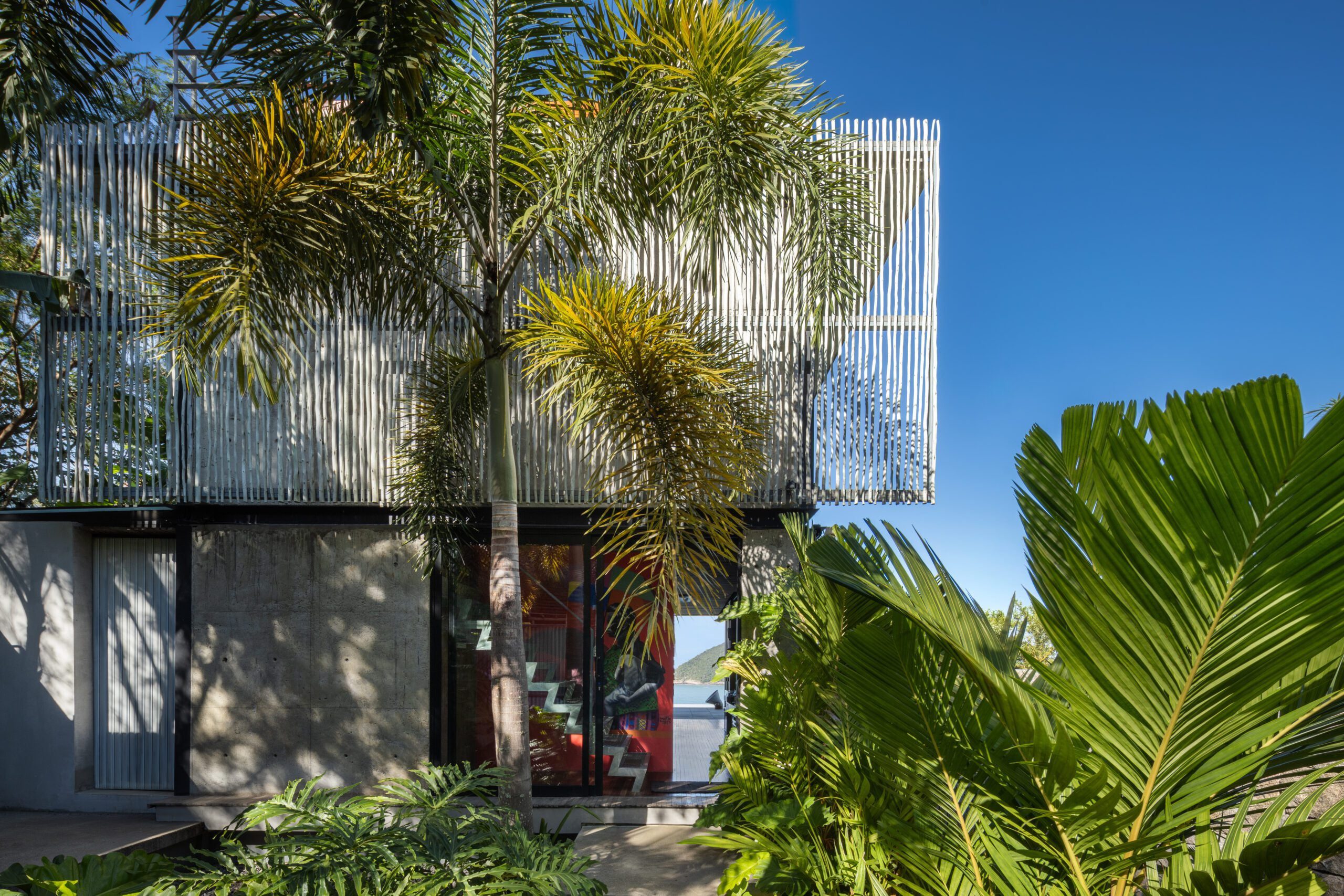 Com dois pavimentos, a casa foi idealizada para um empresário de 74 anos e suas duas filhas. O projeto reflete a conexão emocional do cliente com a ilha, que frequenta há mais de 40 anos.