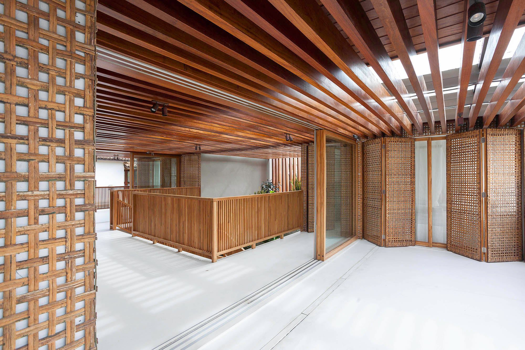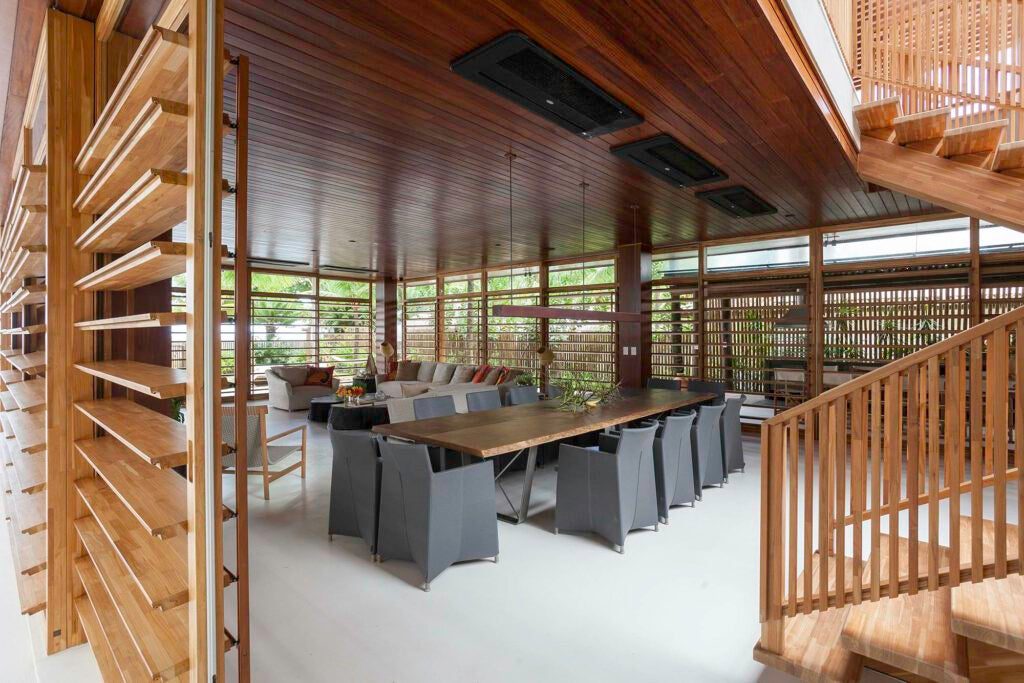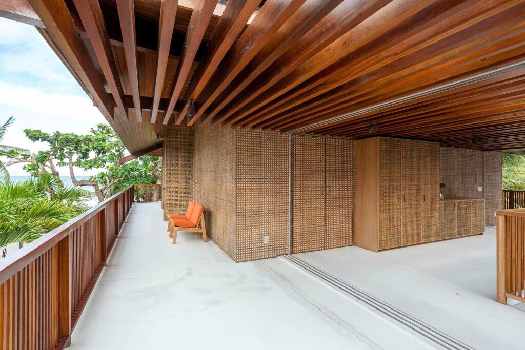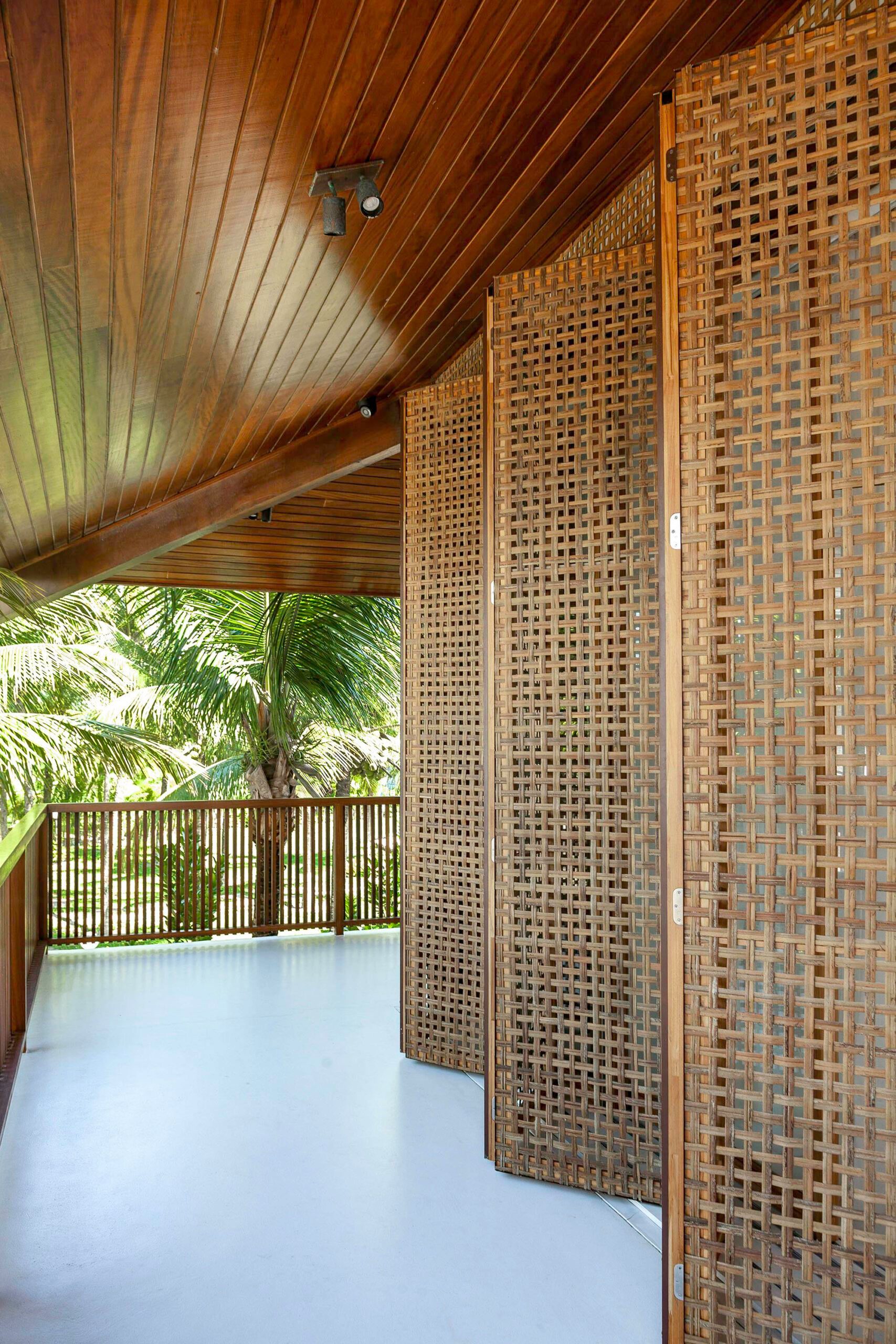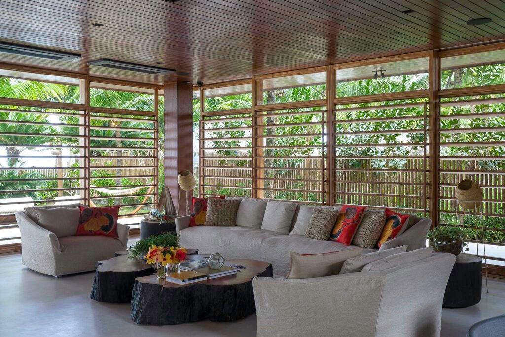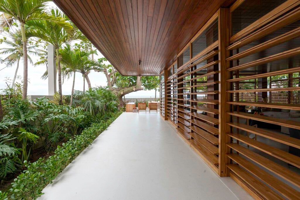Brises articuláveis em madeira e vidro transparente garantem privacidade e ventilação natural.
