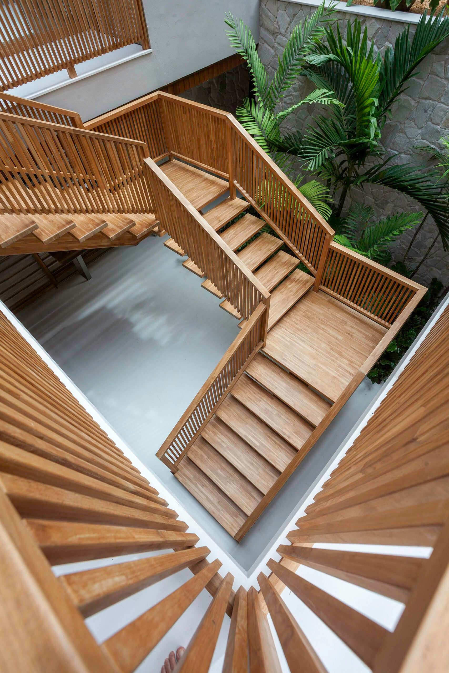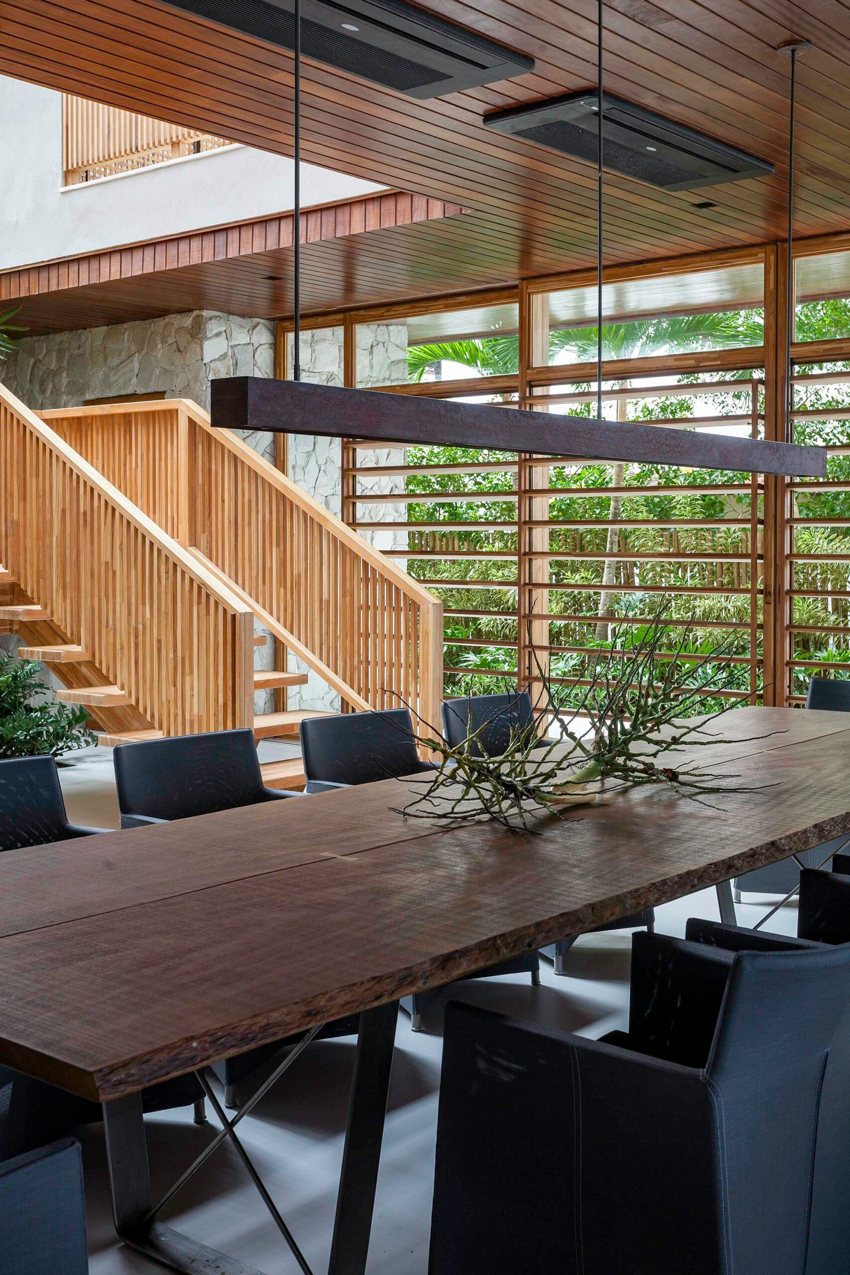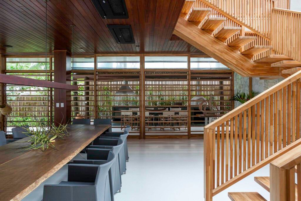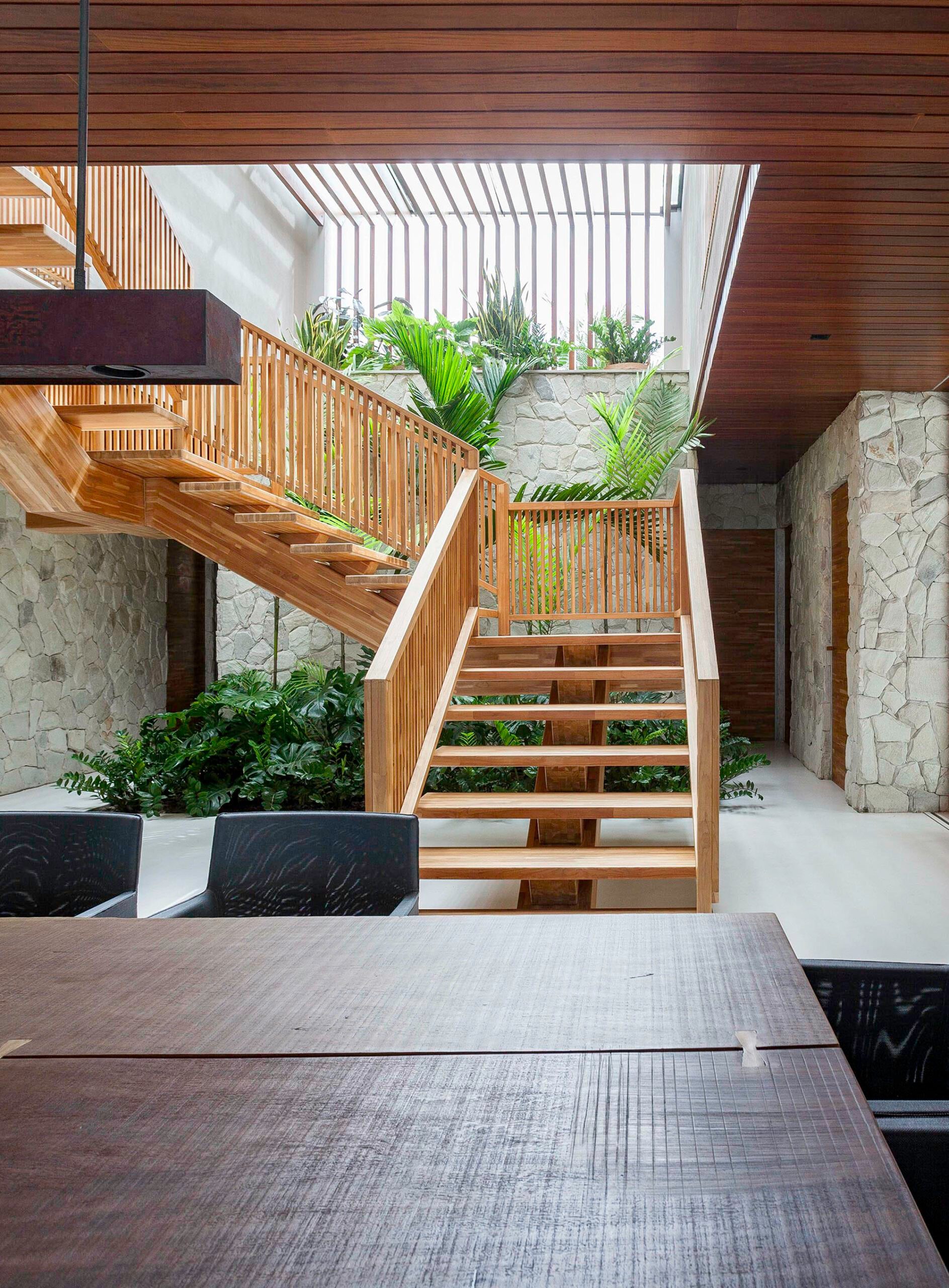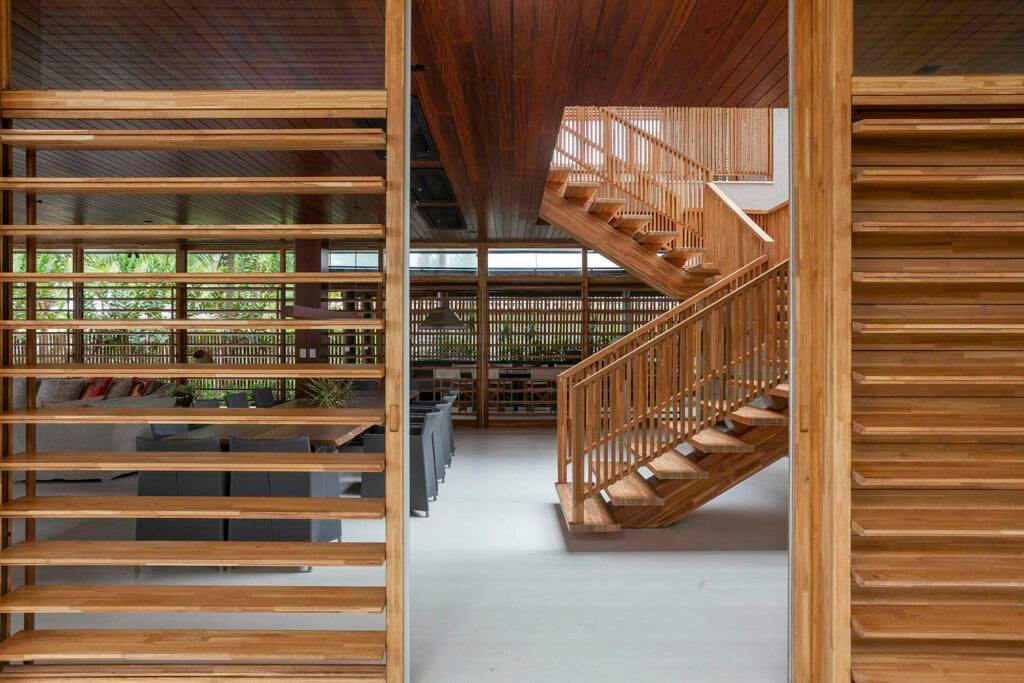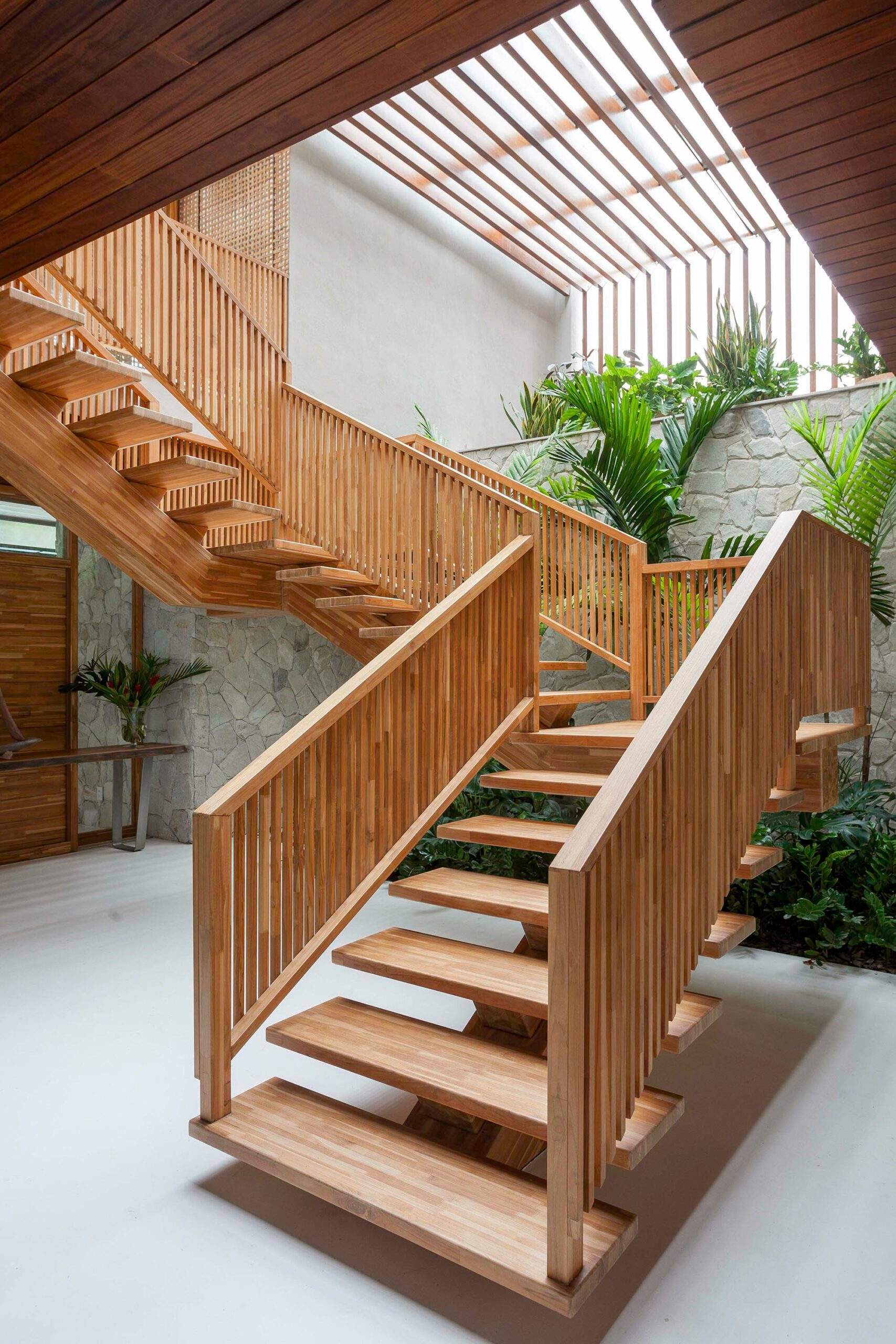 Escada de madeira imponente, com cobertura de vidro e ripas que funcionam como brises.