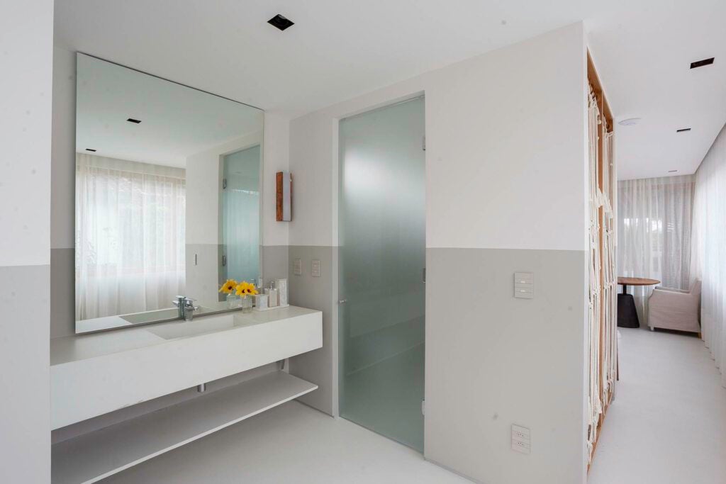 Os lavabos seguem a mesma linha de design, com pedras rústicas e materiais neutros.