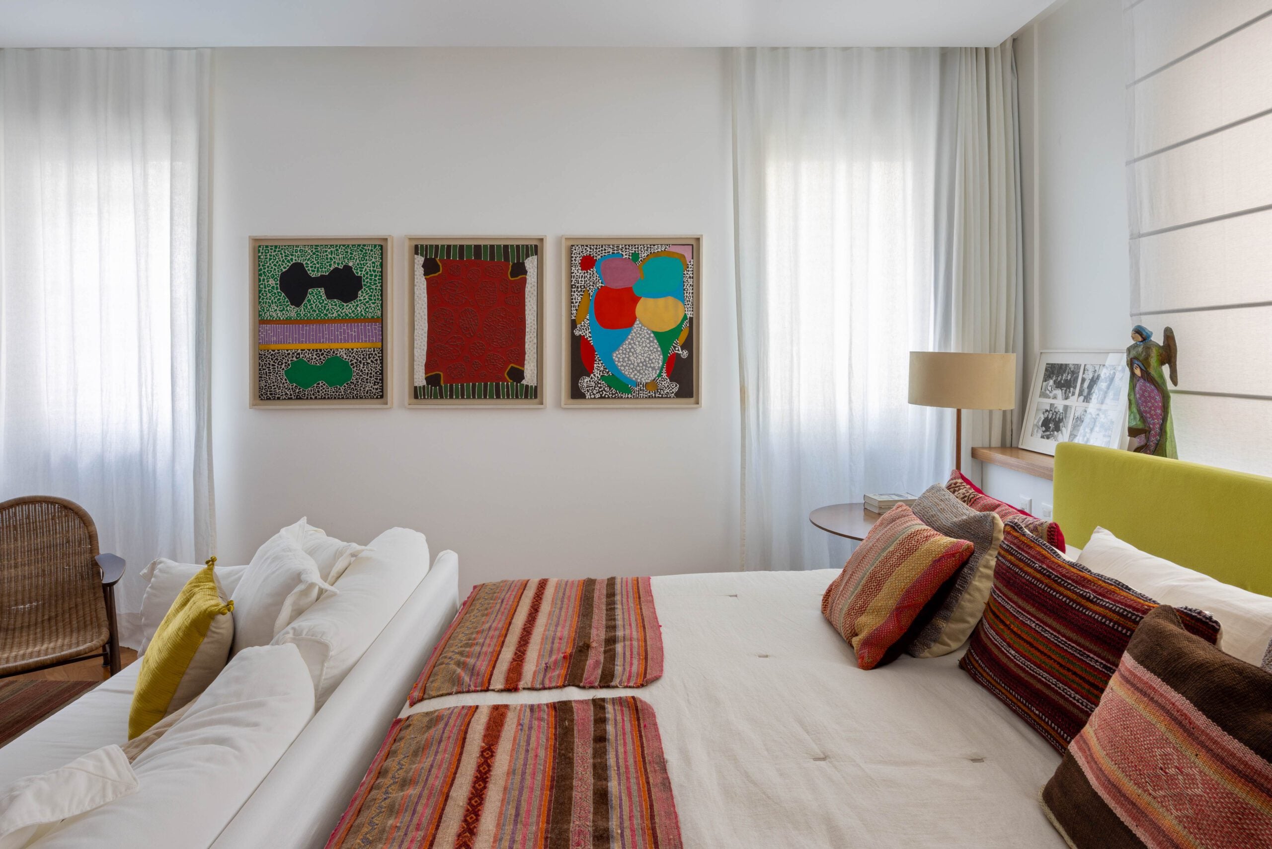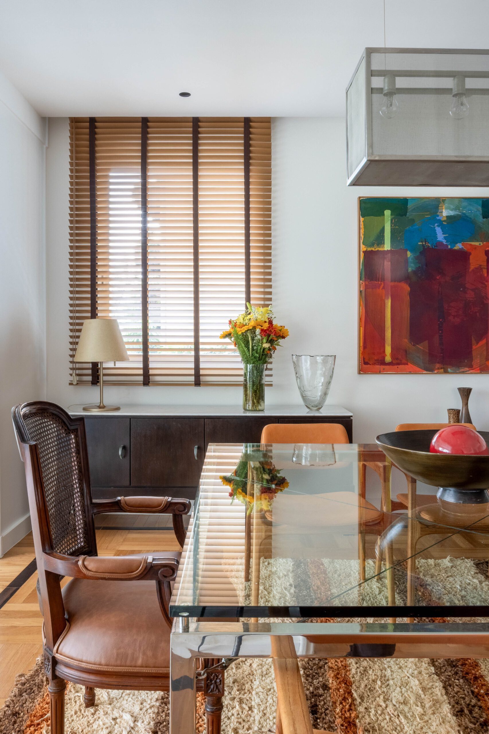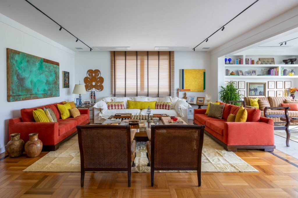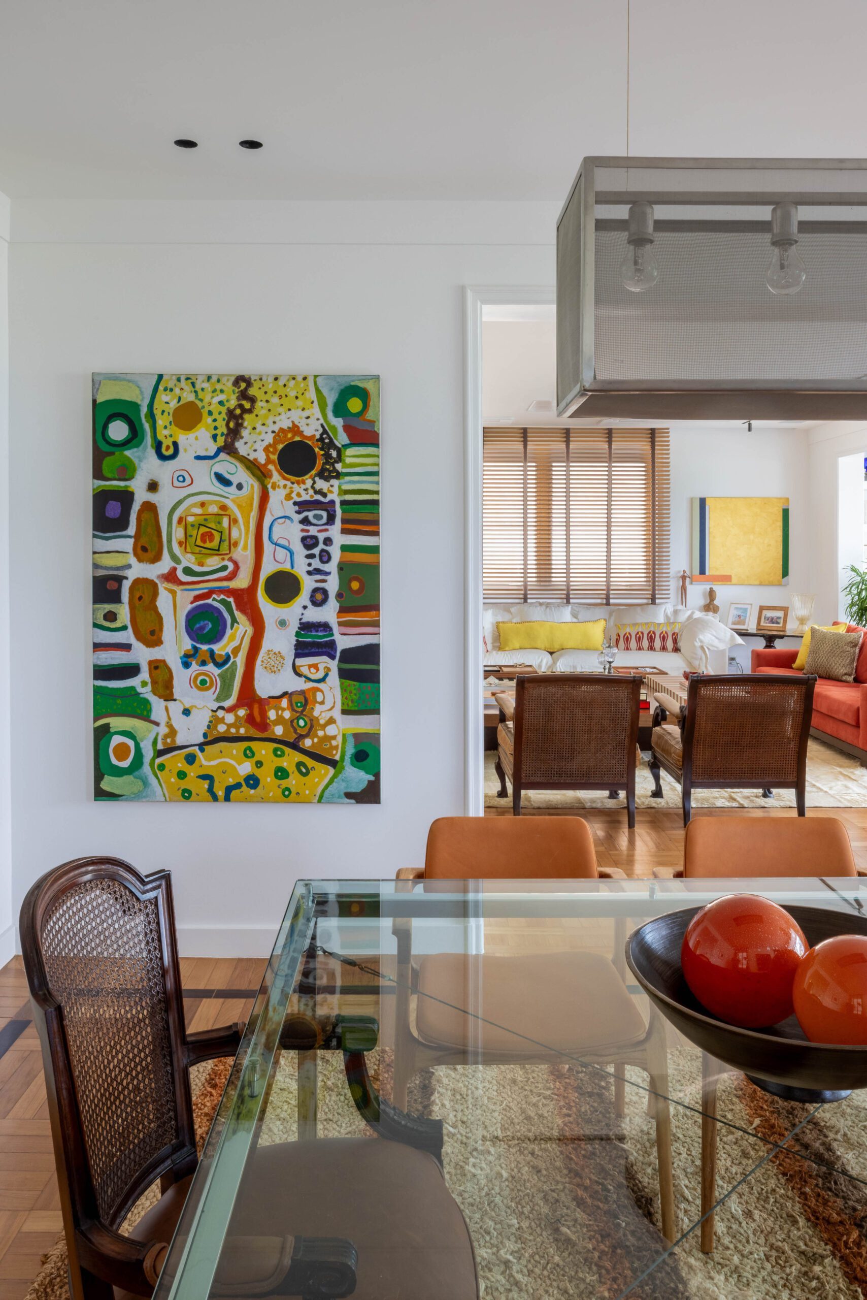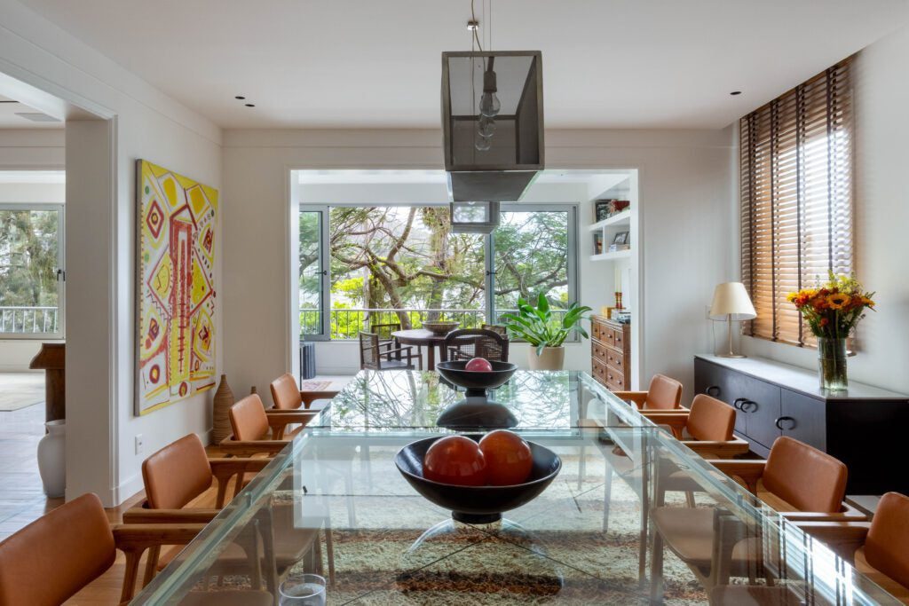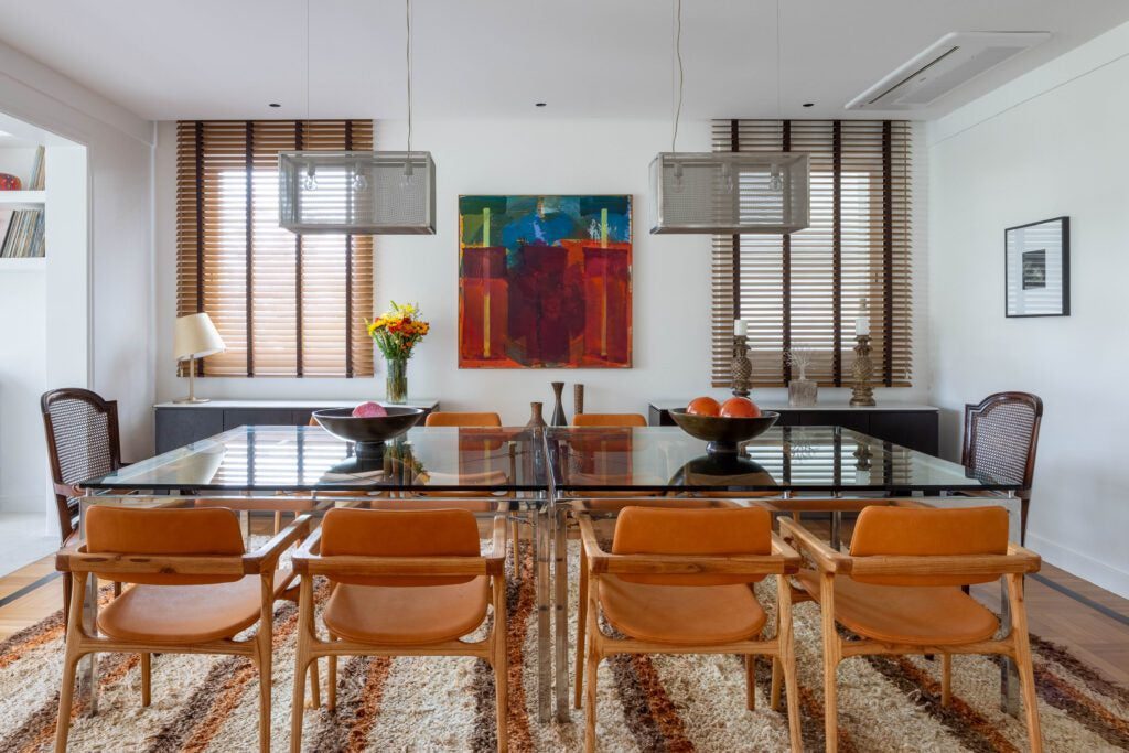 Na área social, a planta original foi preservada, mantendo estar, jantar e varanda integrados. Os pisos de parquet e mármore também foram mantidos, reforçando a elegância atemporal do conjunto. O destaque fica para o acervo de arte, composto por peças coloridas e expressivas, muitas delas herdadas de um tio e carregadas de valor afetivo. As obras ajudam a intensificar a atmosfera vibrante do projeto, que combina memória, cor e personalidade de forma natural.