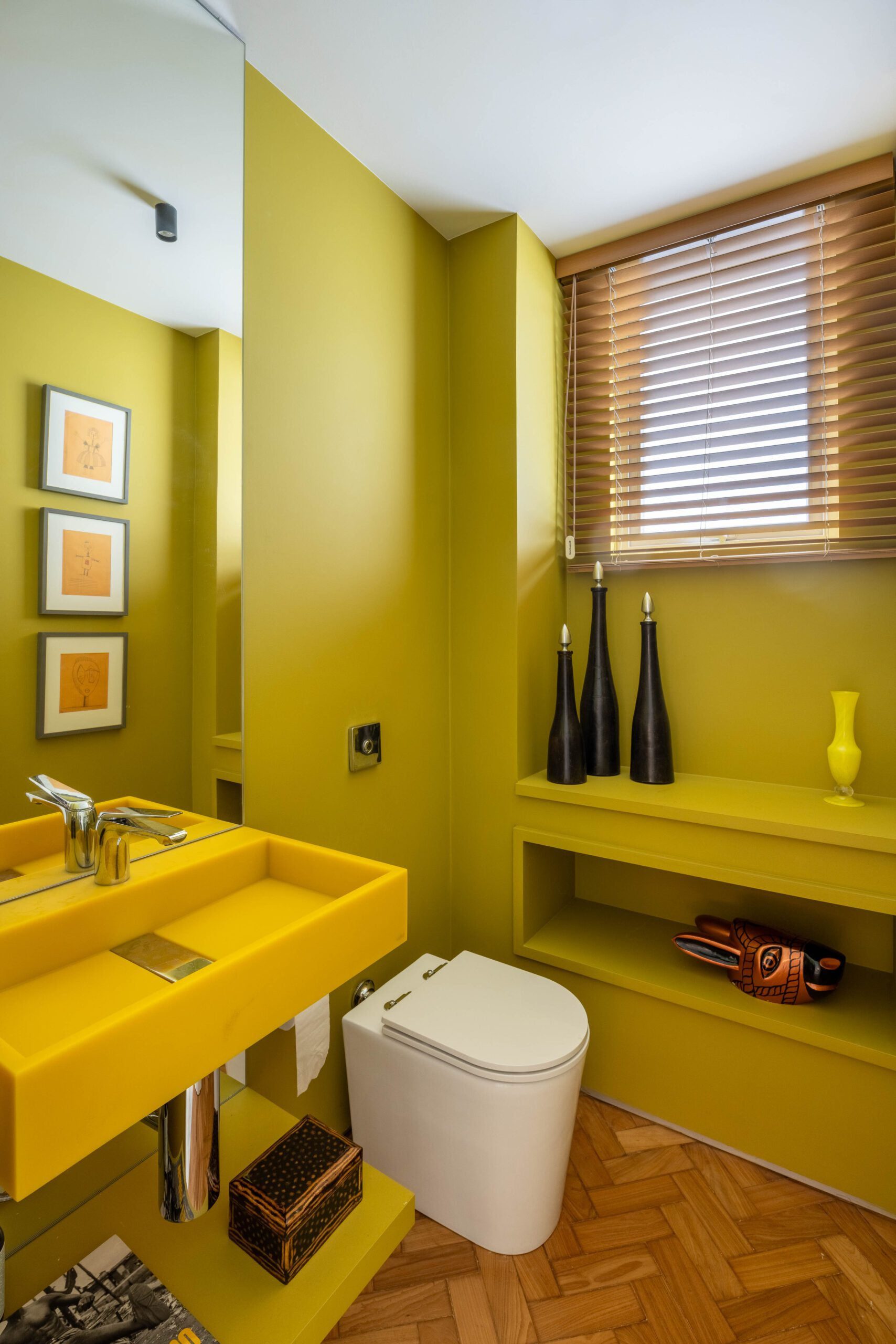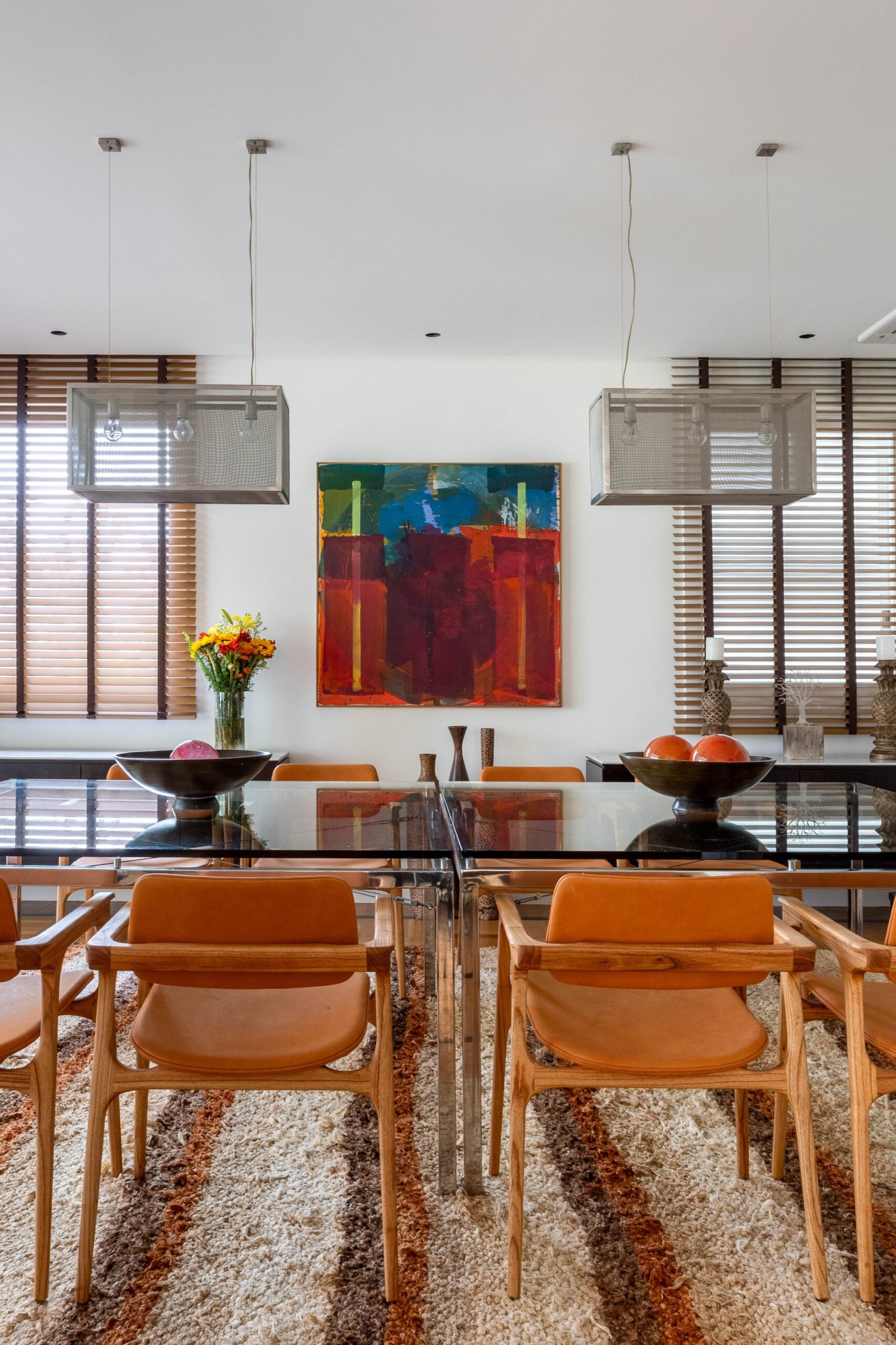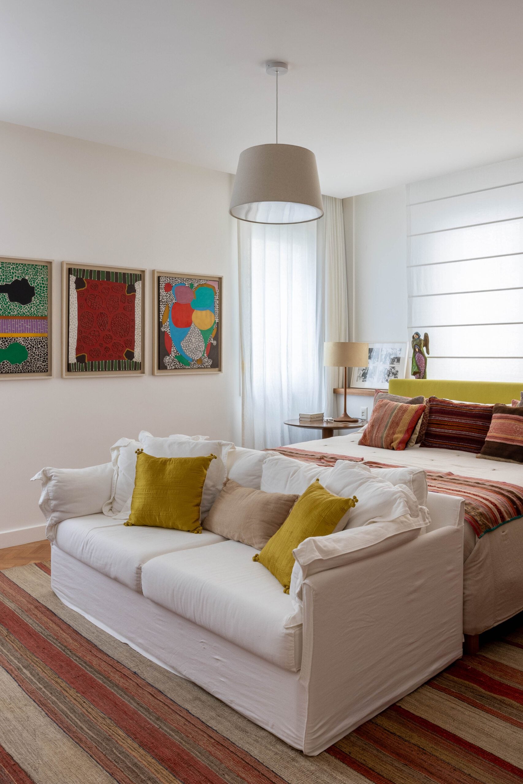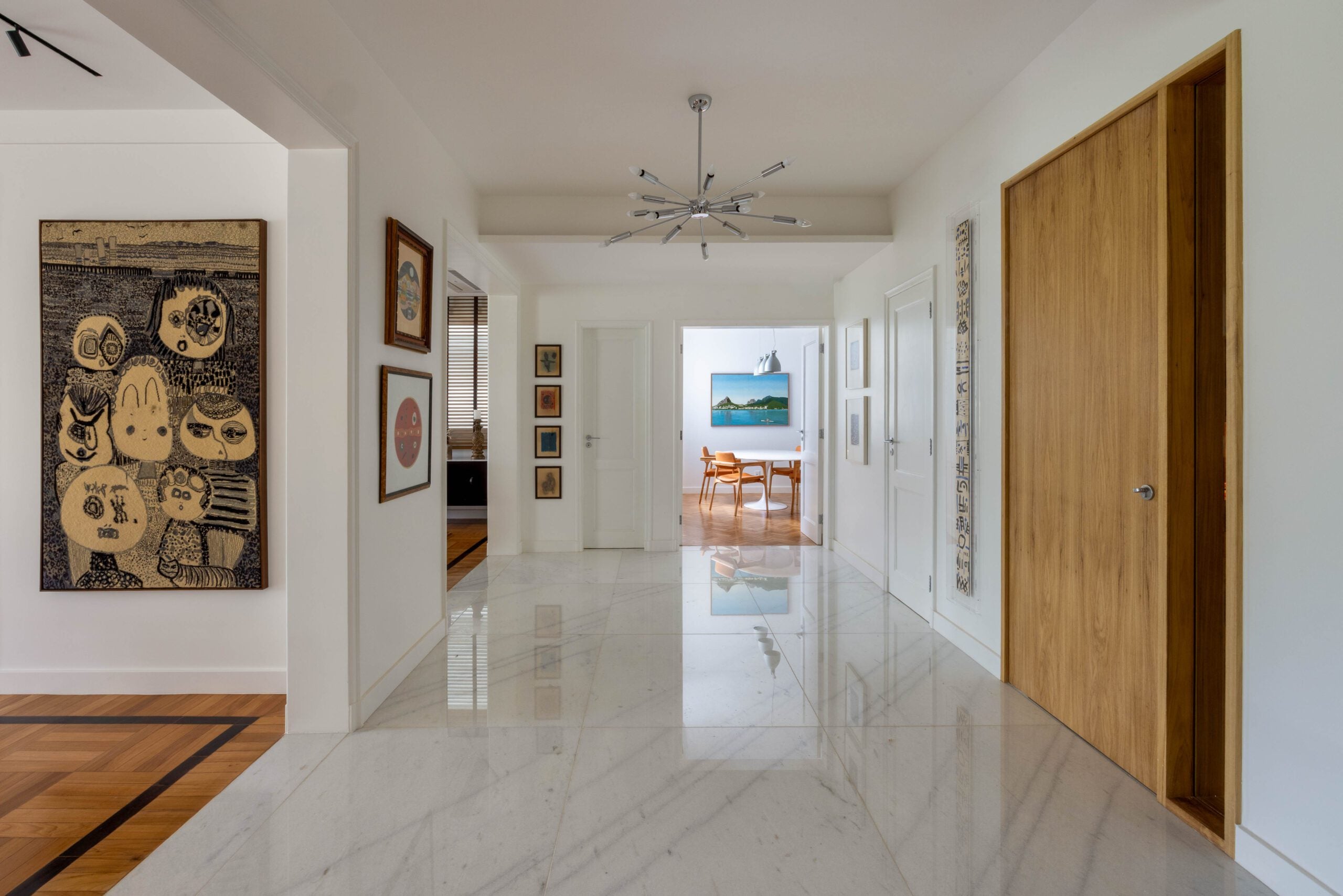 Na área social, a planta original foi preservada, mantendo estar, jantar e varanda integrados. Os pisos de parquet e mármore também foram mantidos, reforçando a elegância atemporal do conjunto. O destaque fica para o acervo de arte, composto por peças coloridas e expressivas, muitas delas herdadas de um tio e carregadas de valor afetivo. As obras ajudam a intensificar a atmosfera vibrante do projeto, que combina memória, cor e personalidade de forma natural.