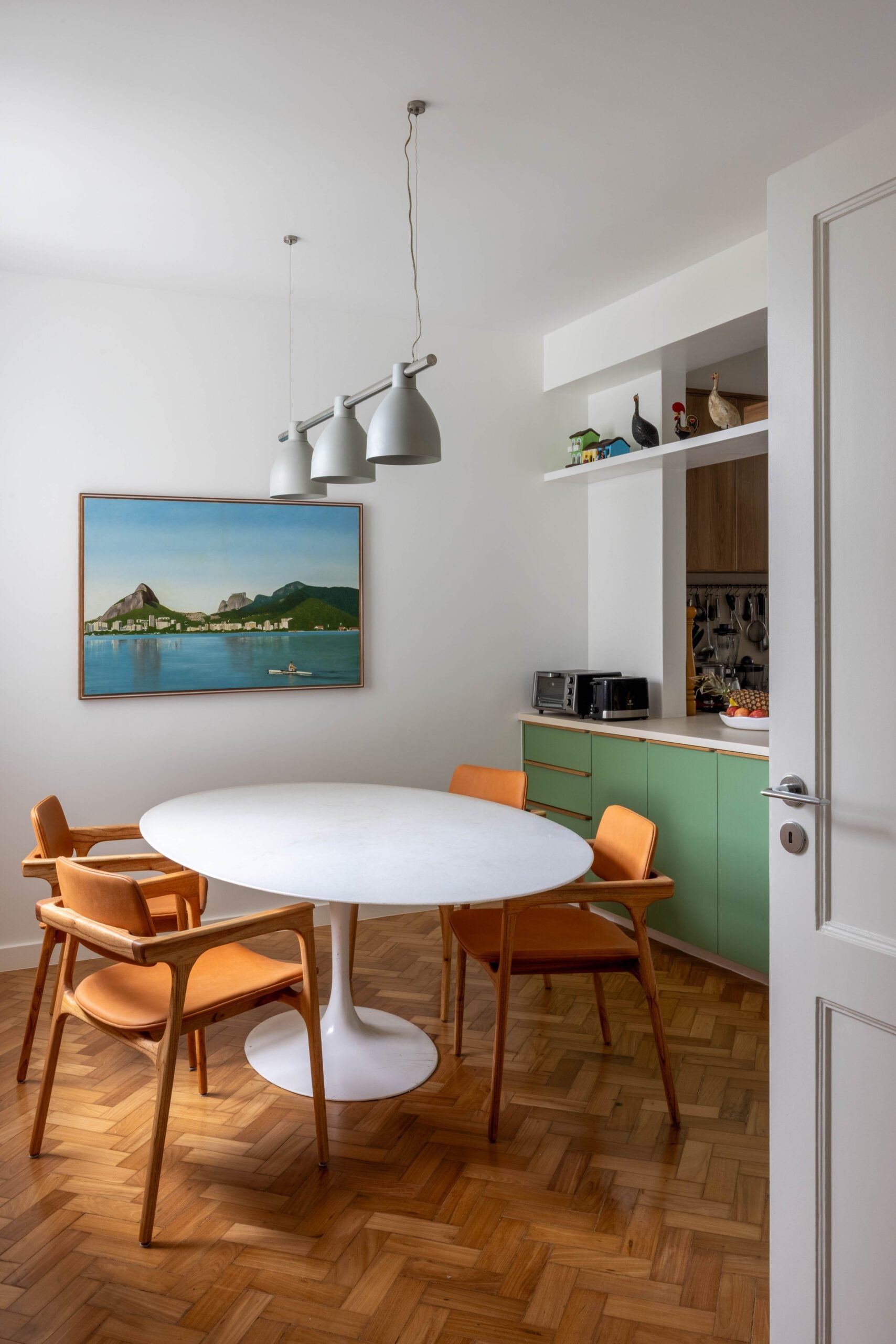 As mudanças mais profundas aconteceram na área de serviço. Parte do espaço foi transformada em closet da suíte principal, enquanto a cozinha passou a se integrar à antiga sala de almoço, agora funcionando como copa. A nova configuração trouxe mais fluidez ao layout e revelou uma vista generosa para a Lagoa, ampliando a relação entre os ambientes e o entorno.