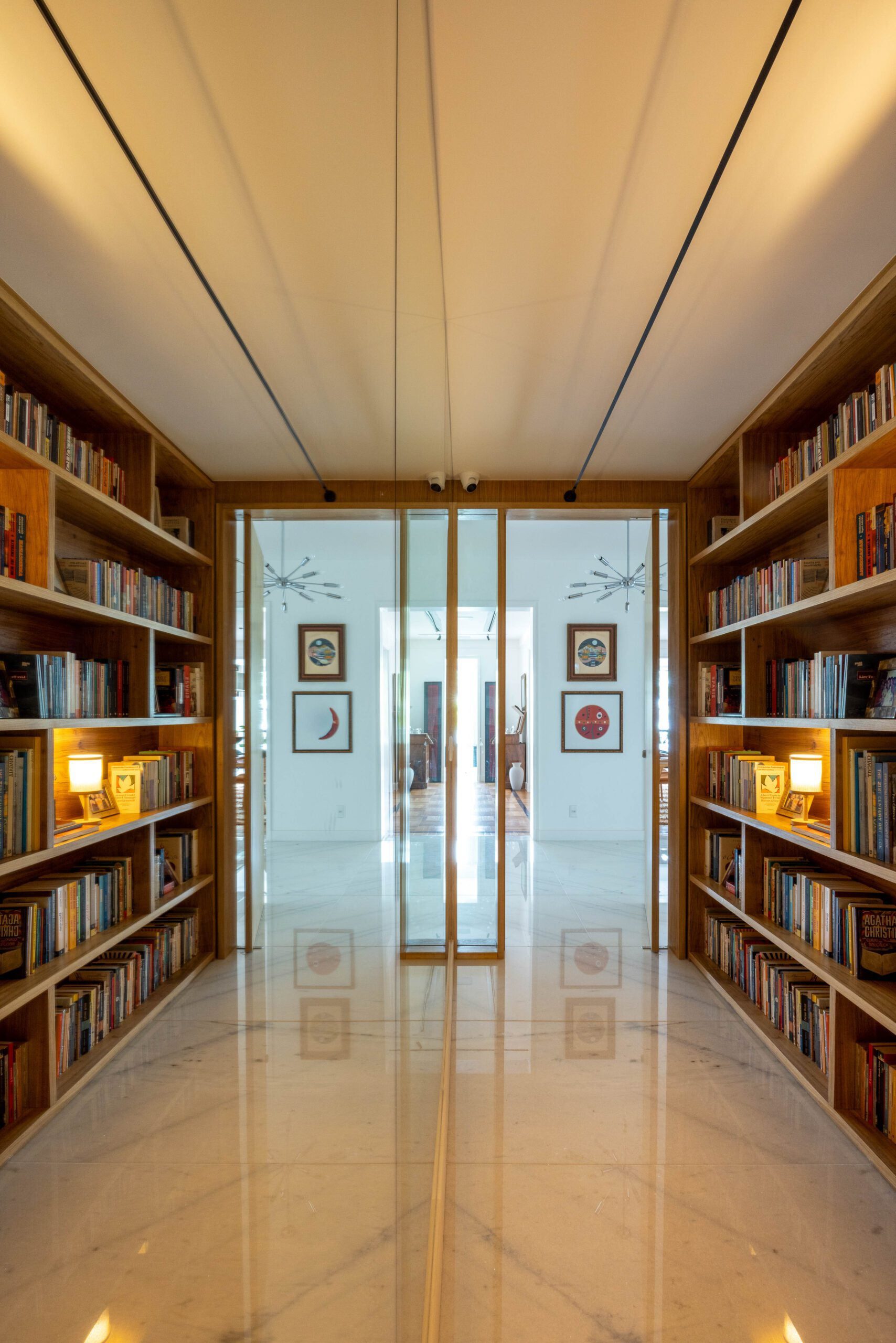 Embora amplo e com uma divisão clássica bem resolvida, o imóvel passou por uma renovação cuidadosa. O ponto de partida foi o hall do elevador, um espaço geralmente negligenciado, mas que aqui ganhou protagonismo. Ampliado, ele passou a abrigar uma adega e uma biblioteca-corredor, marcada por uma grande estante que ocupa toda uma parede e acomoda a extensa coleção de livros da família.