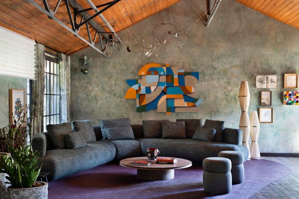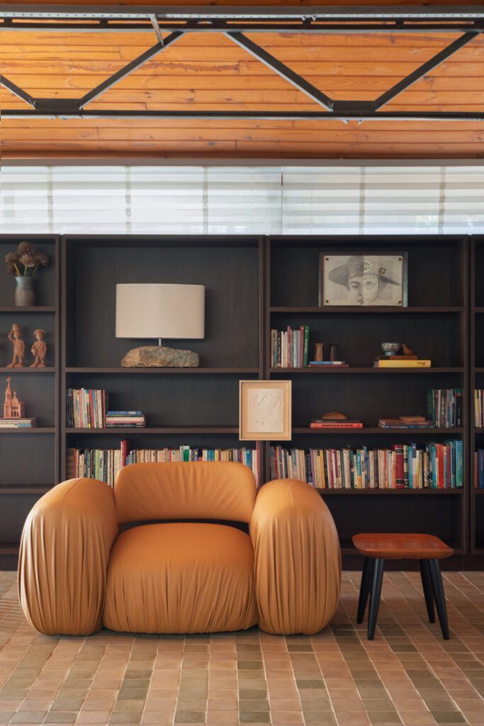 O mobiliário, assinado por Roberta Banqueri e fornecido pela Full House, valoriza as formas curvas — como no sofá Fami e na mesa de centro — em contraste com a rigidez das estruturas metálicas do prédio. “Esse sofá é quase um abraço coletivo. Representa o desejo de receber o público como se fosse parte da nossa grande família.”