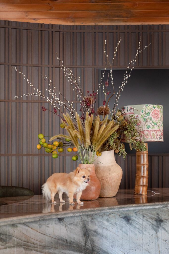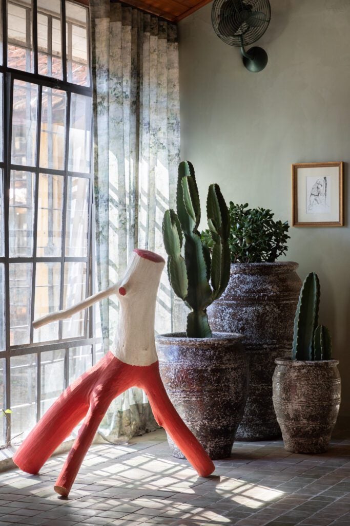 O sertão de Gleuse é um sertão verde, vivo, pulsante — como aquele que ela reencontrou durante uma viagem ao interior do Nordeste. “Vi um cenário completamente diferente do árido que muitos imaginam. Havia cor, movimento e poesia em cada detalhe.” Essa percepção guiou suas escolhas estéticas, como o uso das folhagens verdes desbotadas no papel de parede da Branco.casa, replicadas com leveza também nas cortinas.