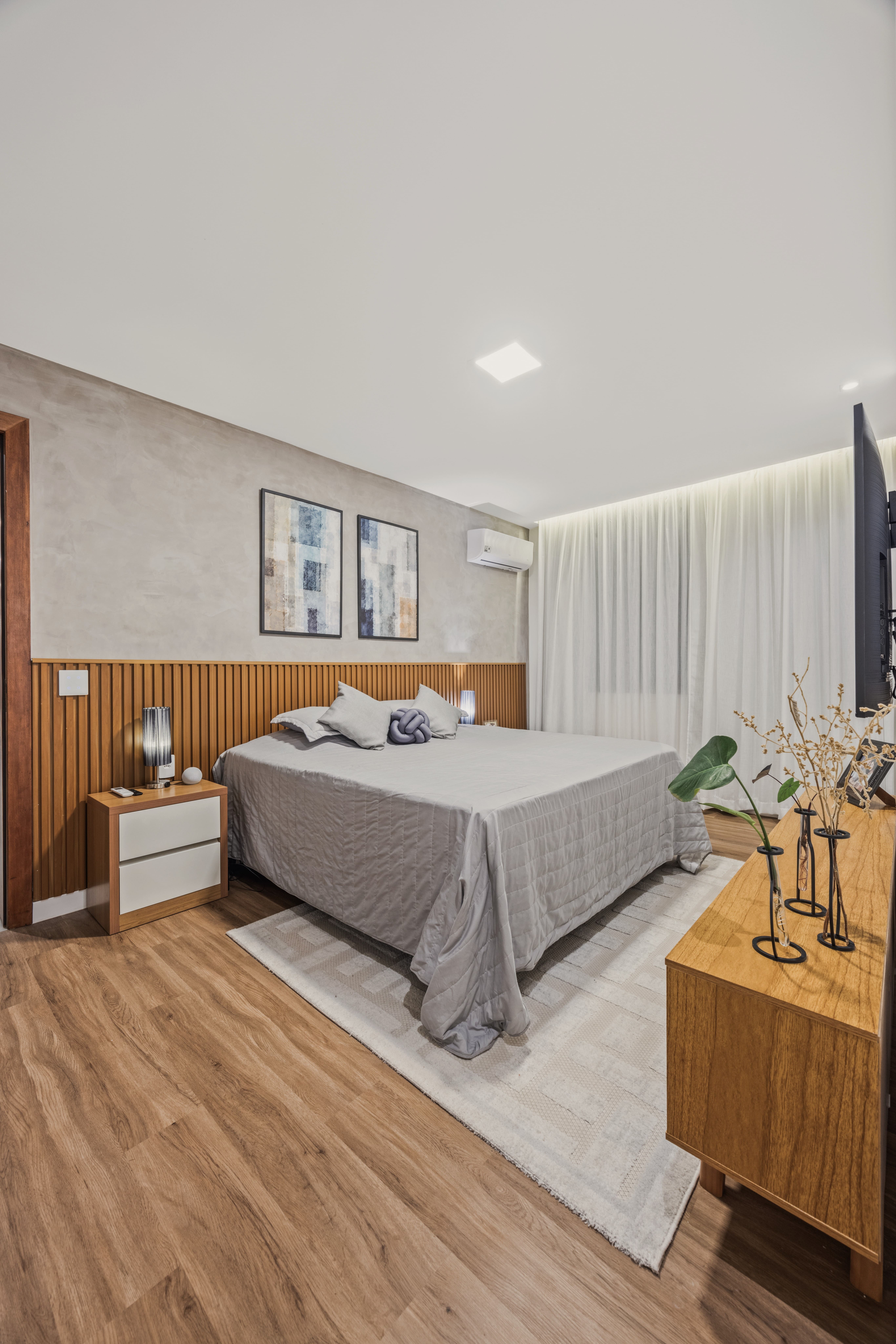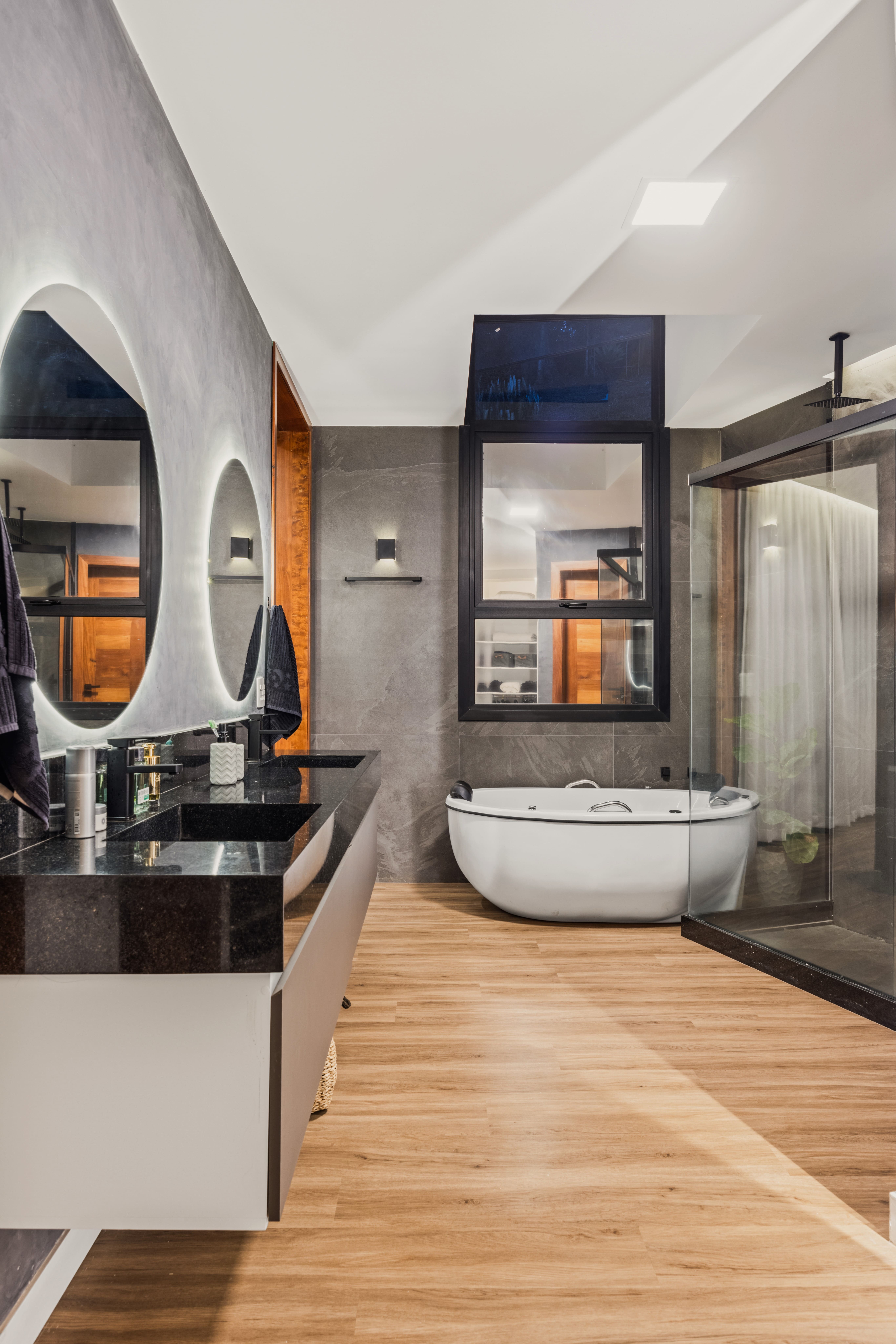 Internamente, a experiência é pautada pela integração. Cozinha e área gourmet se conectam em um espaço contínuo, envolto por grandes panos de vidro que diluem os limites entre interior e exterior. A presença do jardim não é apenas visual, mas sensorial. Nos banheiros, claraboias generosas garantem a entrada de luz natural, criando atmosferas mais suaves e conectadas ao tempo e ao clima.