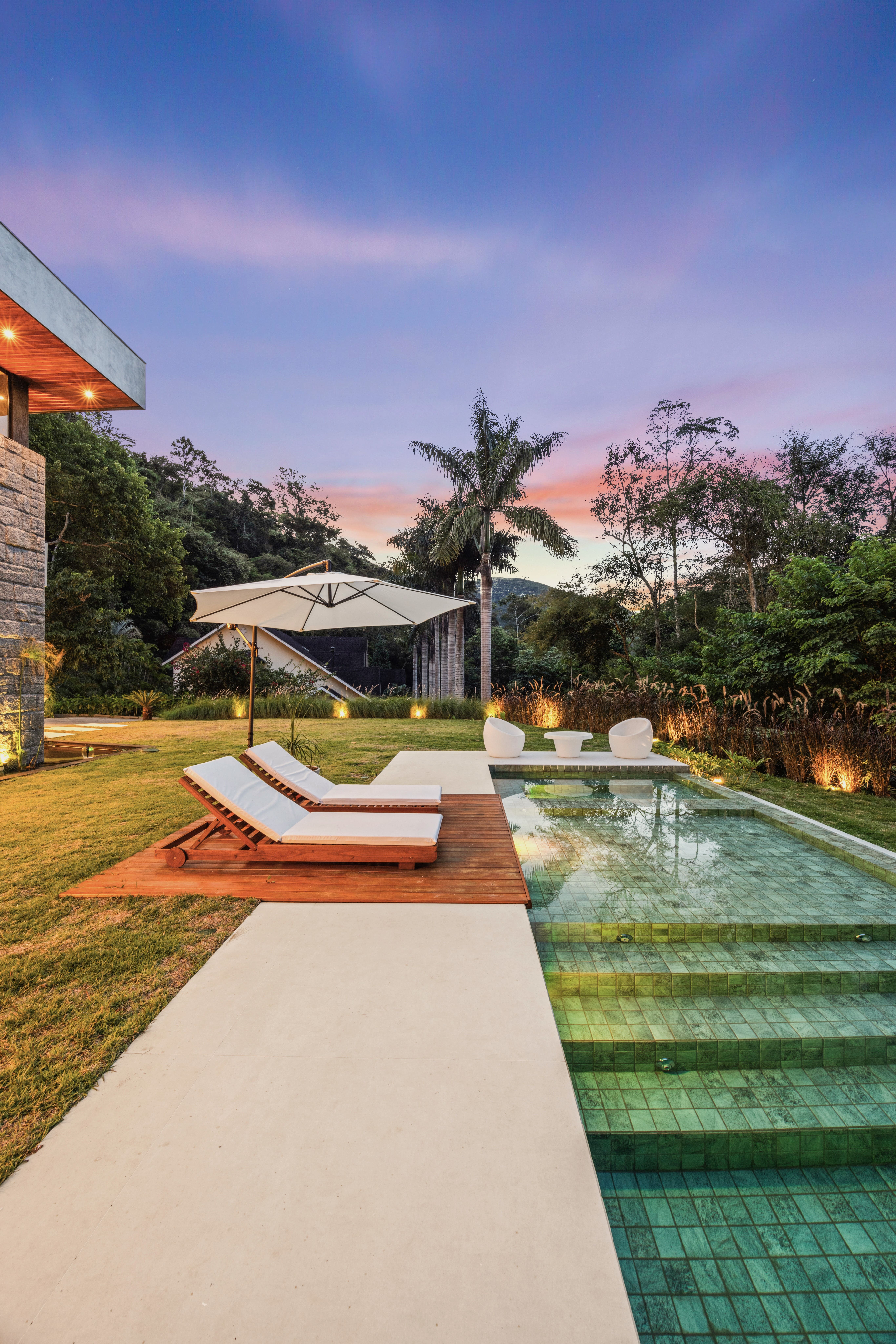 Com 621 m² de área construída, o projeto parte de um desafio claro, ocupar sem dominar. A implantação foi cuidadosamente pensada para preservar ao máximo as áreas naturais, enquanto responde a um programa que exige organização rigorosa entre os espaços sociais e íntimos. A orientação da casa também desempenha papel fundamental, otimizando a insolação tanto para o conforto dos ambientes quanto para a eficiência dos sistemas de energia renovável.