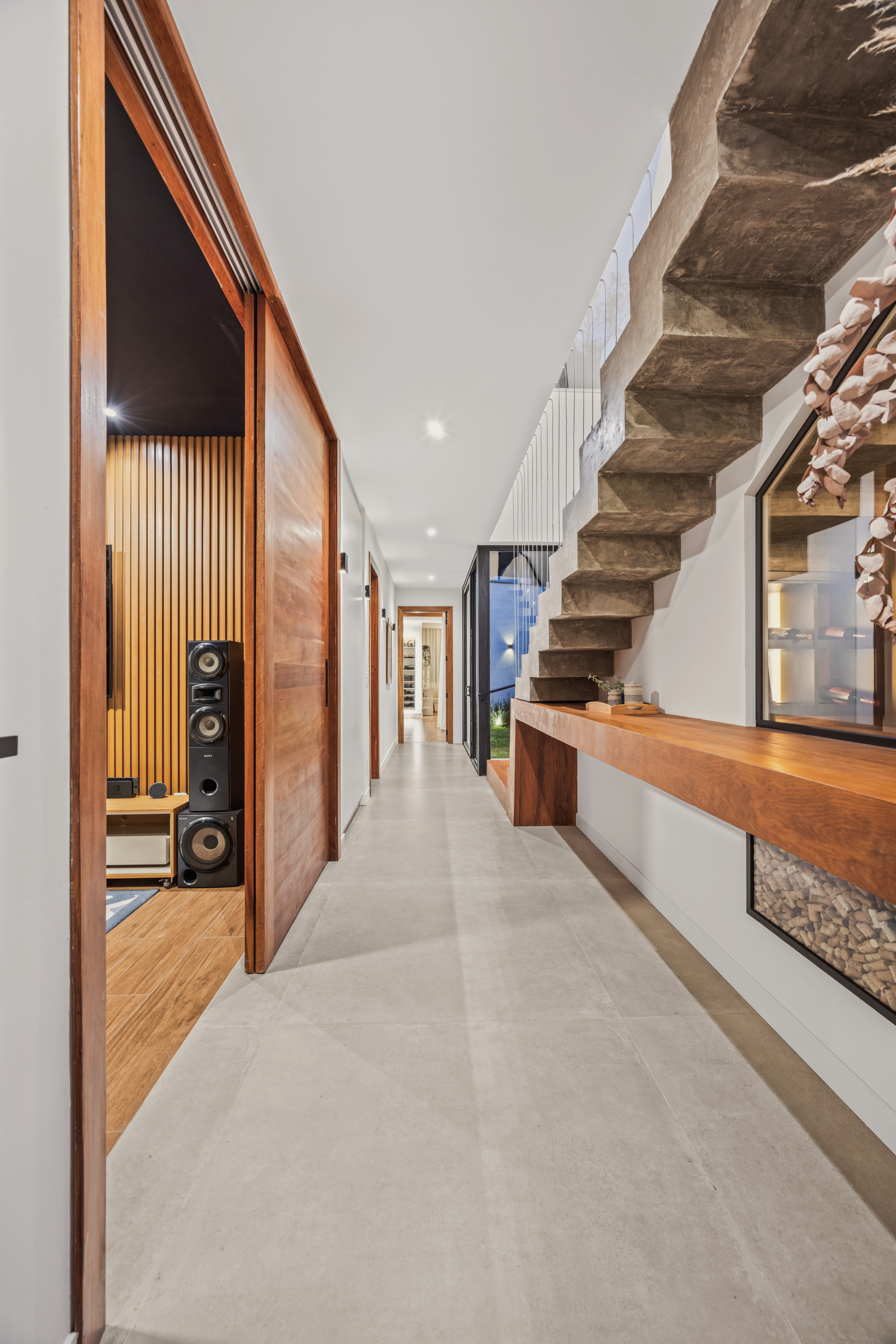O partido arquitetônico se estrutura a partir de volumes puros e bem definidos. Um corpo longitudinal organiza o térreo, enquanto um volume transversal se projeta no pavimento superior, criando um pé-direito duplo marcante logo na entrada. Essa composição reforça a leitura contemporânea da residência e evidencia o cuidado com proporção e escala.