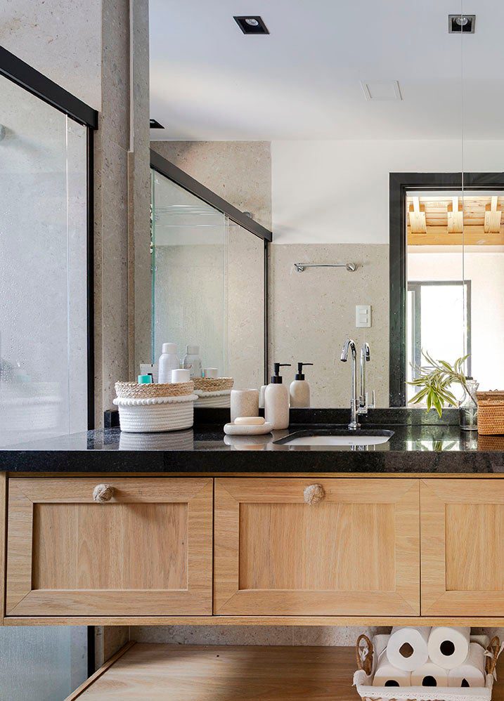 A residência possui três suítes, sendo uma no térreo para hóspedes e as outras duas no pavimento superior, destinadas ao casal e às filhas.