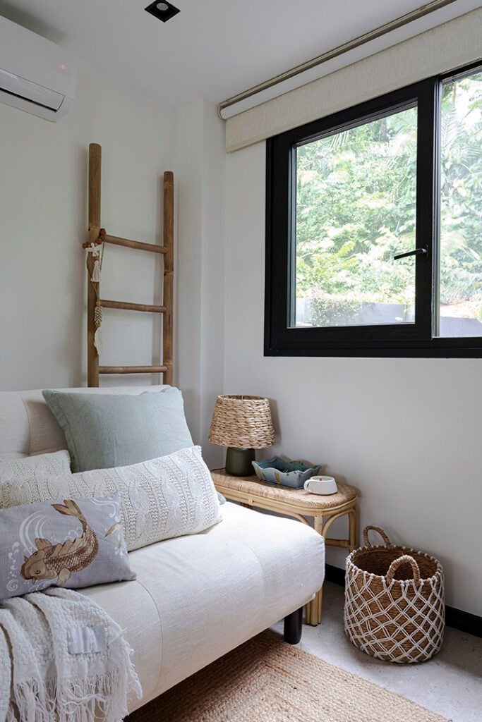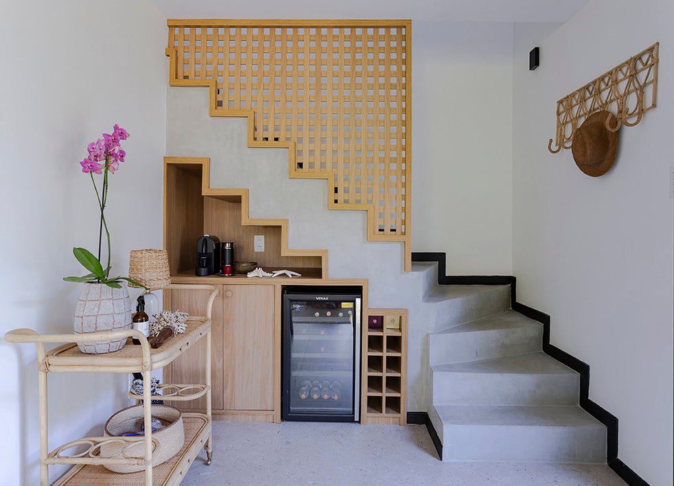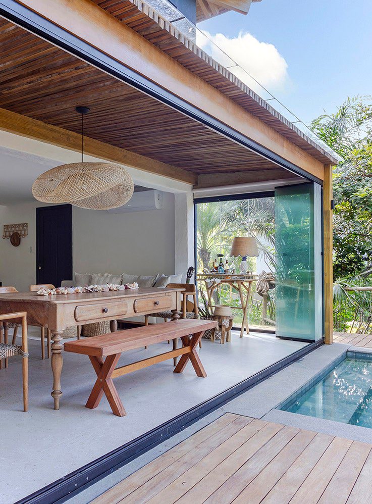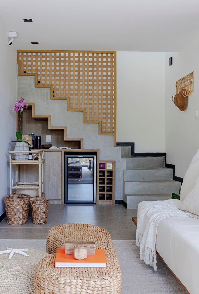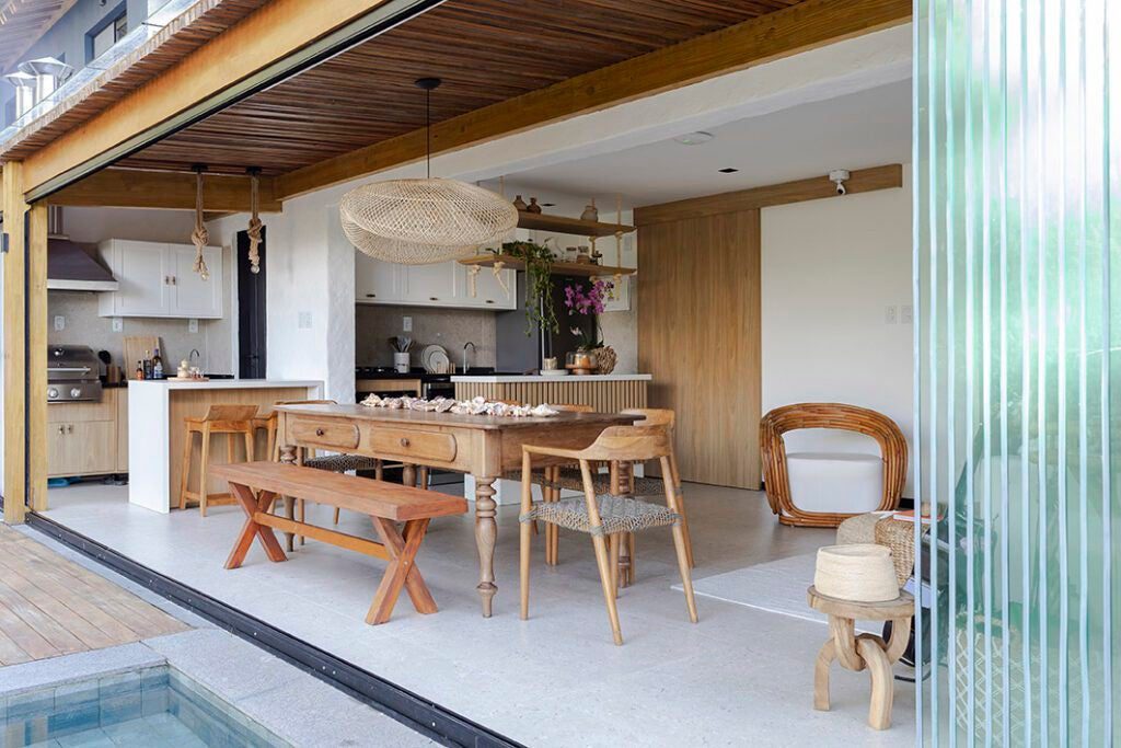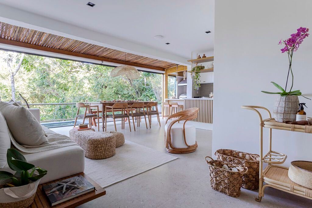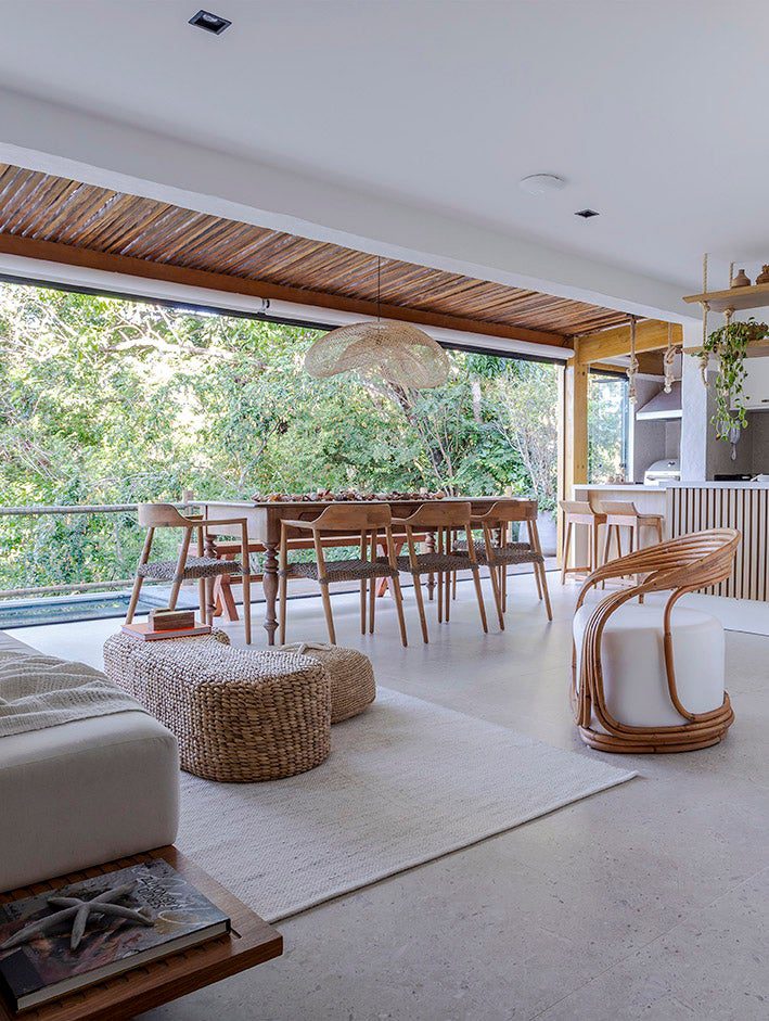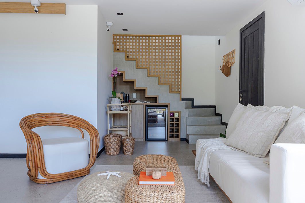 A cliente desejava um ambiente que remetesse ao estilo de Trancoso. Assim, foram escolhidos móveis de materiais naturais e tons claros para os ambientes sociais.