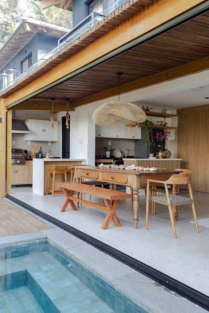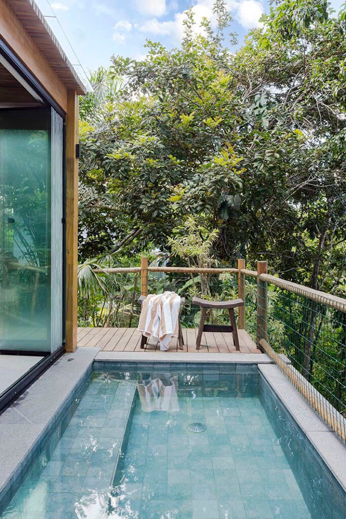 A piscina existente se transformou em um espaço de relaxamento com água aquecida. O deck externo ganhou piso de madeira cumaru.