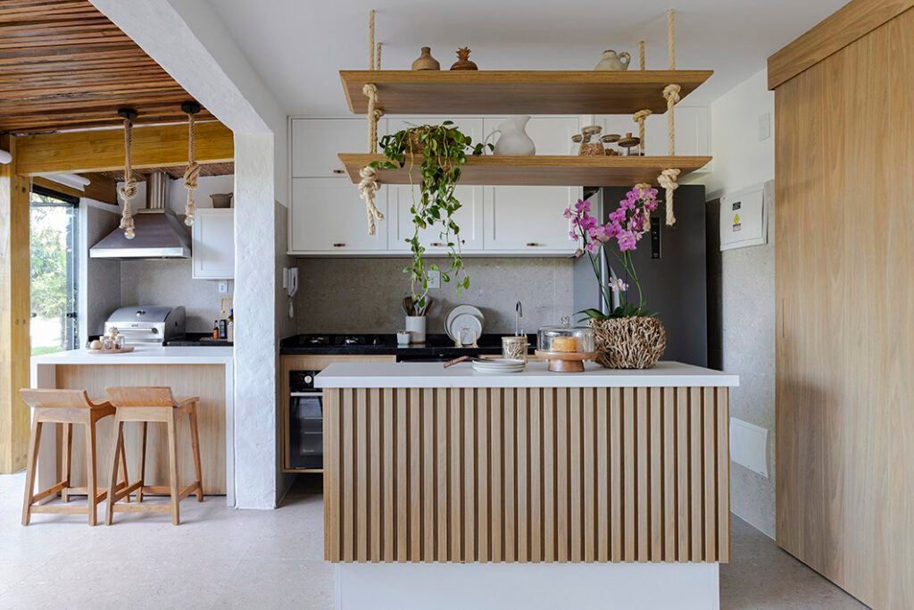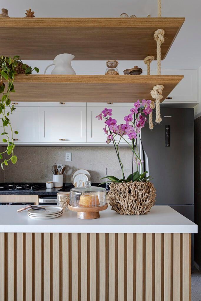 A marcenaria personalizada foi cuidadosamente executada, com destaque para prateleiras suspensas, cordas de sisal e puxadores trazidos de viagens, que adicionam um toque especial à decoração.