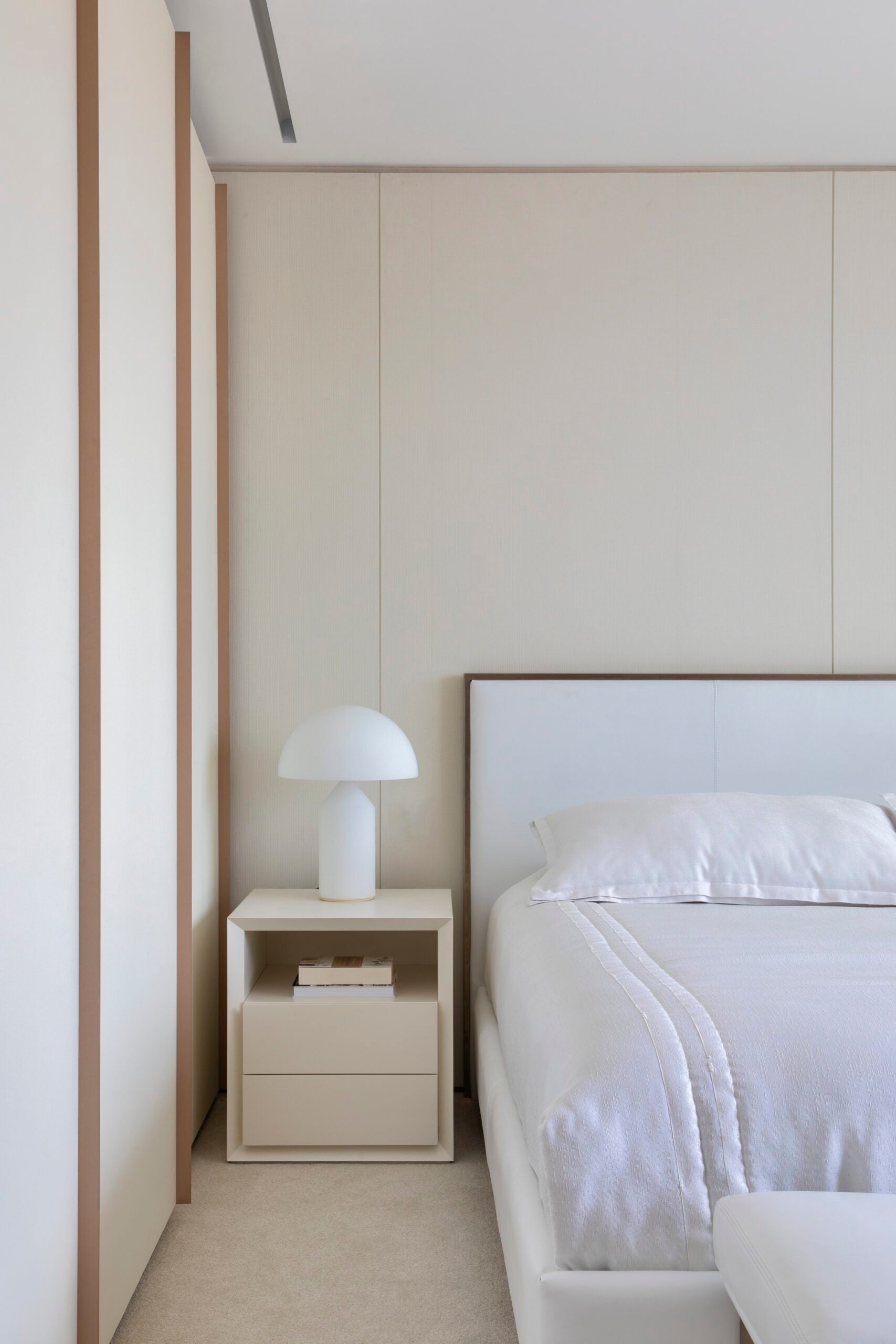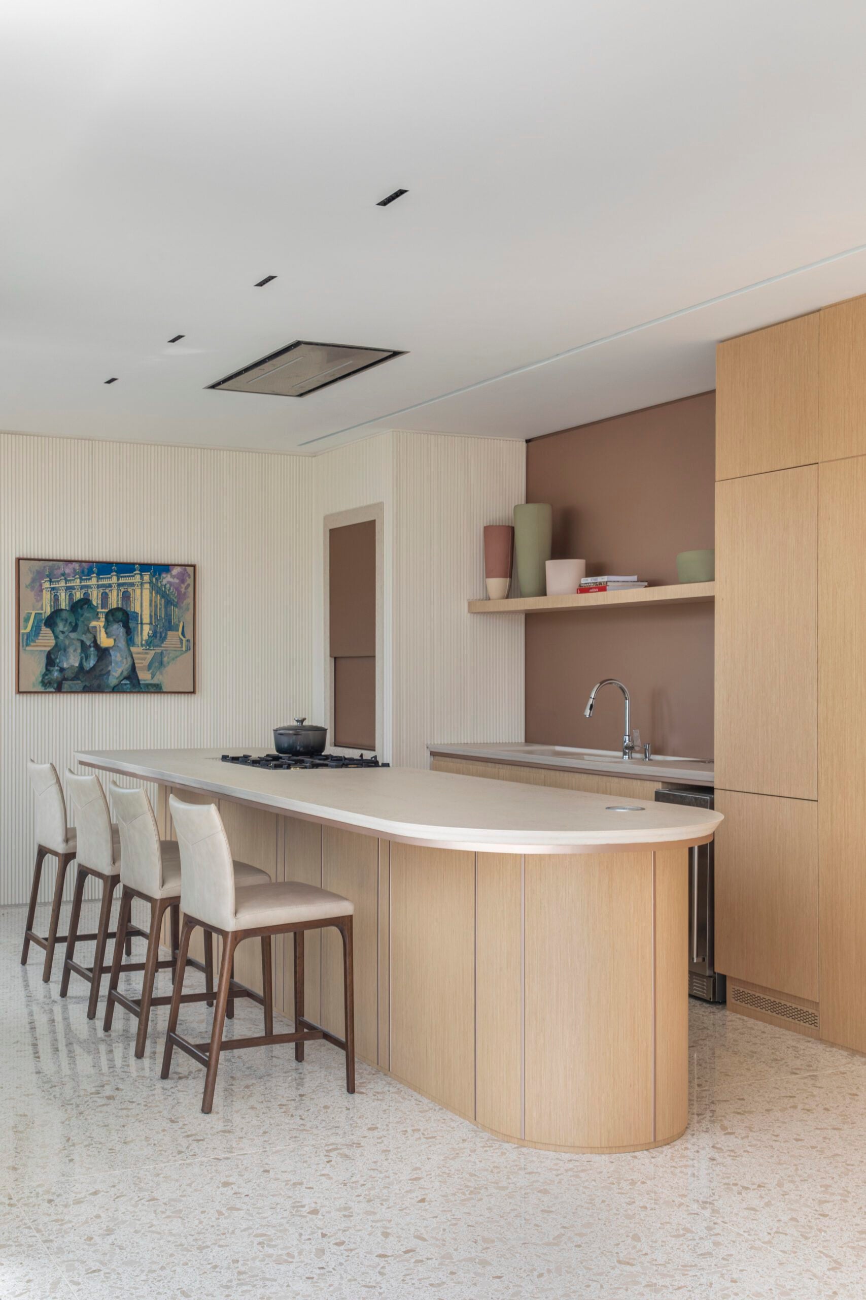 O ponto de partida foi uma paleta de tons suaves, que se desdobra em materiais cuidadosamente selecionados: lastras com grandes fragmentos de mármore, cimento bege e madeira clara com padrão linear. A marcenaria, executada em laca clara e ripado delicado, reforça o equilíbrio entre sofisticação e simplicidade.