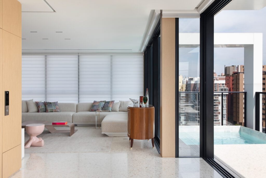 A atmosfera é complementada por persianas automatizadas Hunter Douglas, da linha Pirouette, fornecidas pela M.Decor, que permitem o controle da luz natural e reforçam o conforto visual.