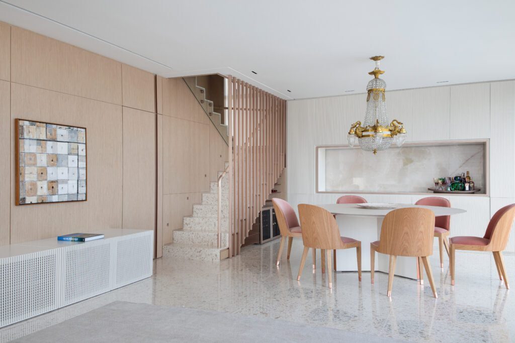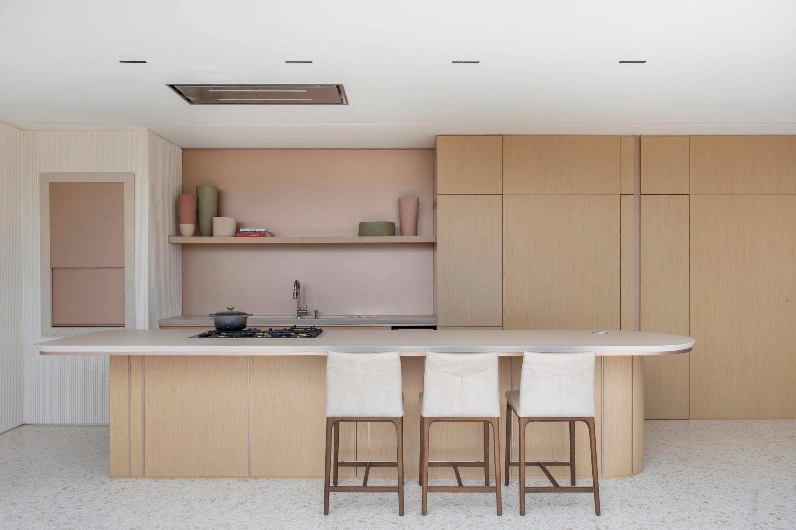 Segundo Jayme Bernardo, a base do projeto consistiu em três elementos principais: o piso, a lâmina de madeira e a definição da paleta rosada. Esses materiais foram aplicados em todos os ambientes para garantir coesão visual e cromática, criando uma atmosfera harmônica e agradável.