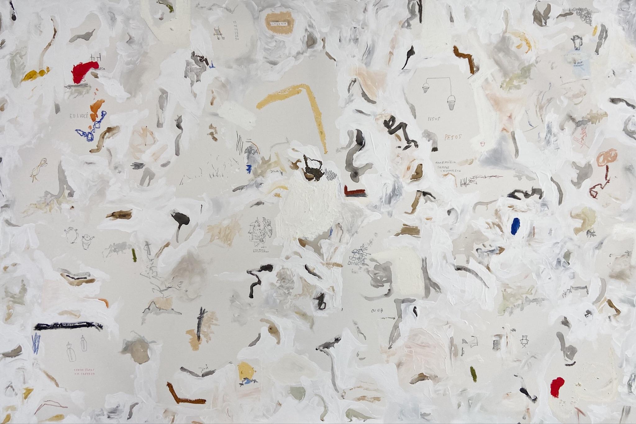 No caso de Giovana Gobbi, a pintura e o desenho se tornam campos de investigação sensível do cotidiano. Suas obras carregam memórias, objetos e cenas simples, transformadas em narrativas visuais carregadas de afeto e subjetividade. Elementos como maçã verde, bule imaginário, hortênsias e bala de banana surgem em composições que convidam o espectador a percorrer trajetórias não lineares, ora aproximando, ora distanciando o olhar. Ao lado de Giovana, João Arthur Moroni propõe uma arqueologia do olhar, com narrativas visuais que partem de signos do corpo, da memória e do banal, compondo uma investigação que se cruza com o gesto pictórico da artista em pontos de tensão, sobreposição e intervalo.