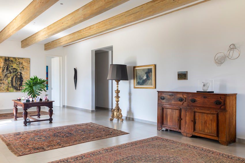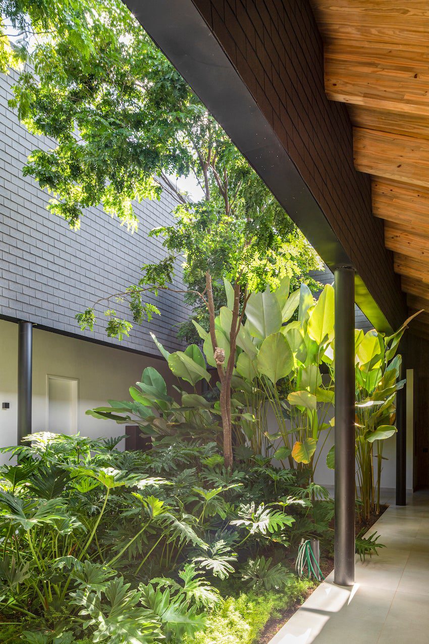 Pensada para uma artista plástica e sua família, a casa de 950 m² organiza um programa amplo que inclui ateliê, áreas sociais generosas e espaços íntimos acolhedores. A distribuição privilegia a fluidez entre os ambientes e reforça a conexão com o exterior, ao mesmo tempo em que preserva a sensação de refúgio.