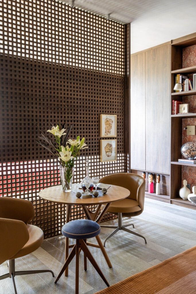 A paleta de cores e a seleção criteriosa de objetos revelam histórias e memórias em cada detalhe. Surge uma vibração cosmopolita que se mistura à sofisticação, marcada pela presença de obras de grandes nomes da arte moderna brasileira — como Yutaka Toyota e Gonçalo Ivo — em diálogo com artistas contemporâneos, entre eles Adriana Banfi e Patrícia Guerriero.