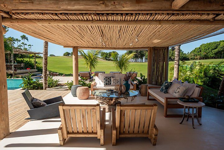 Os pilares e vigas de eucalipto reforçam a integração com a natureza.