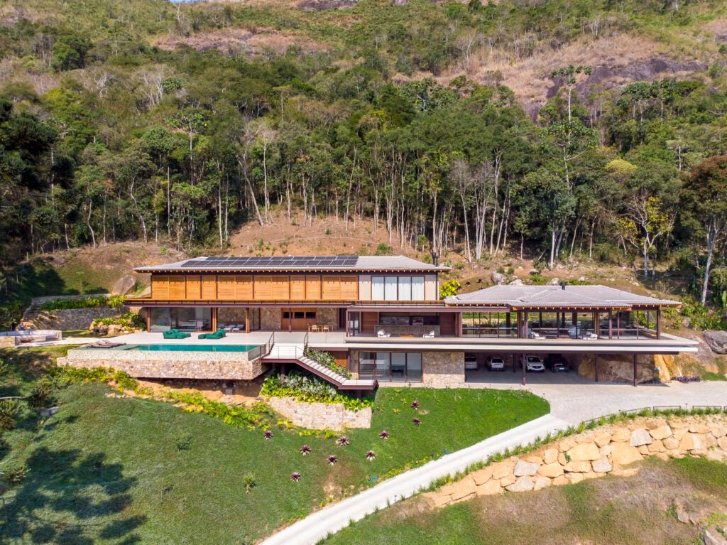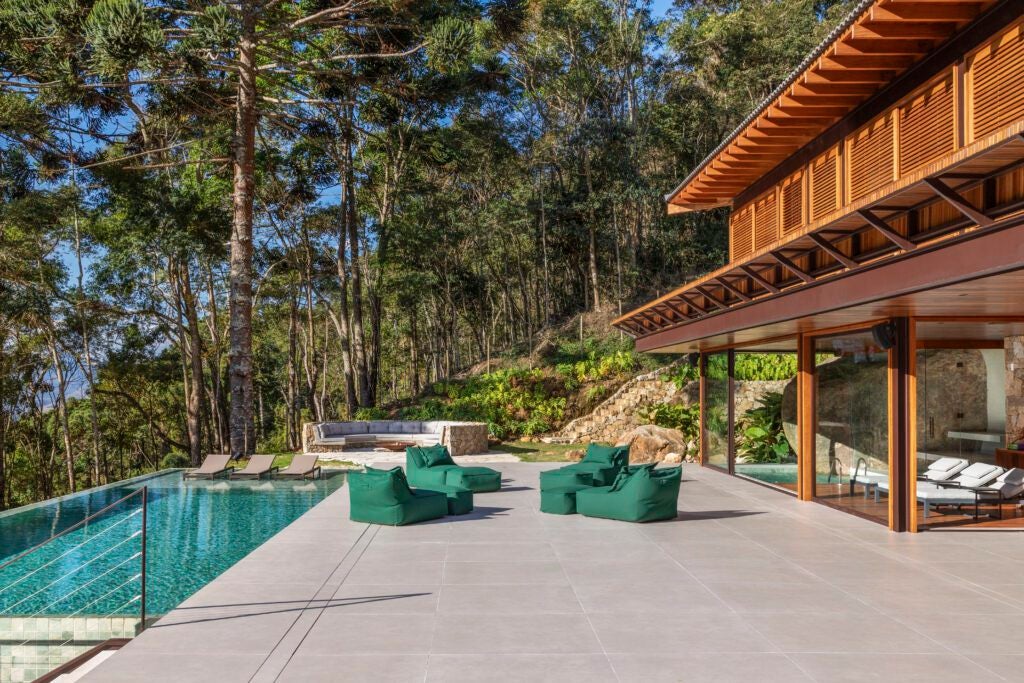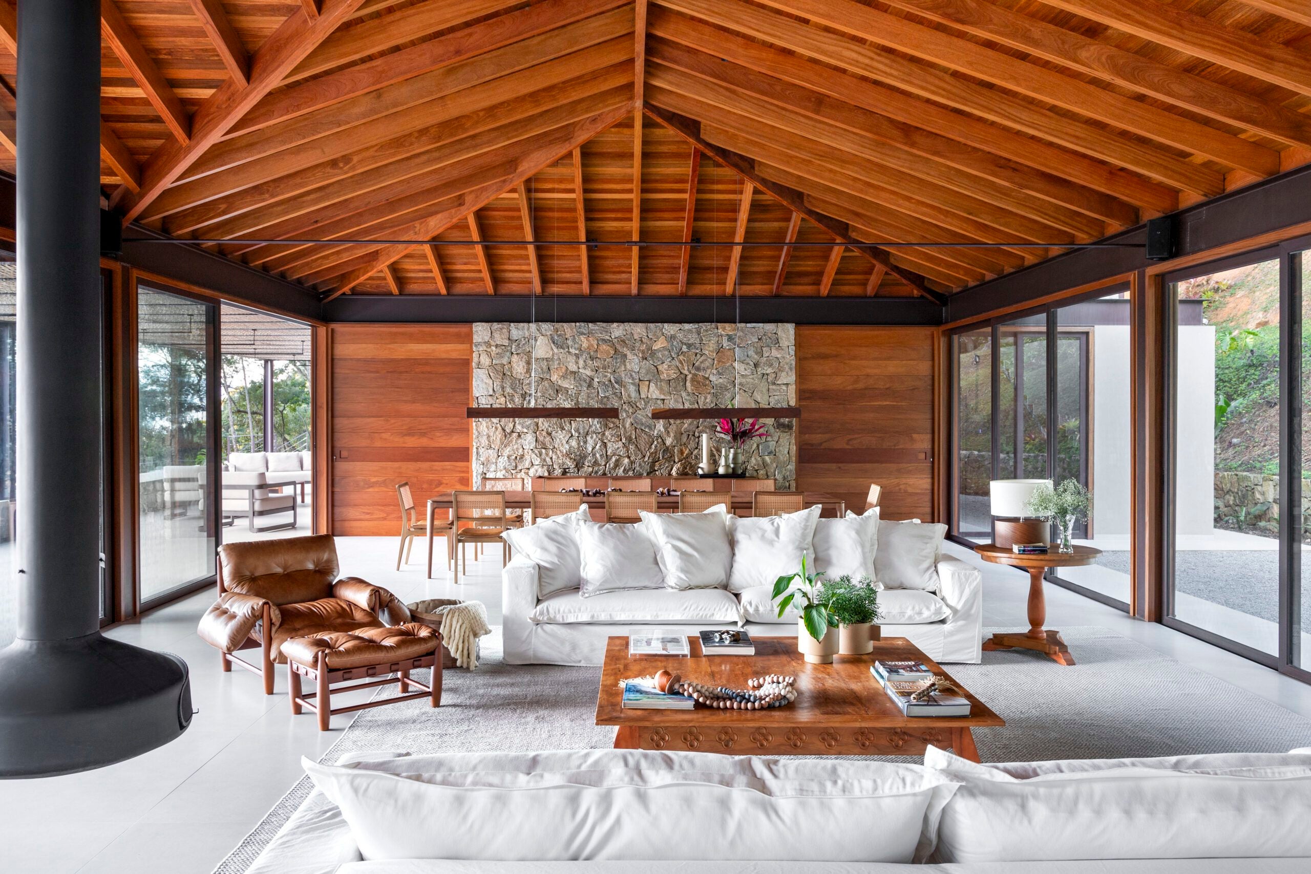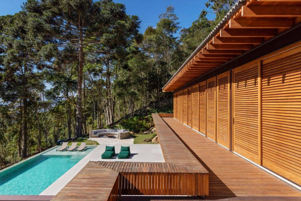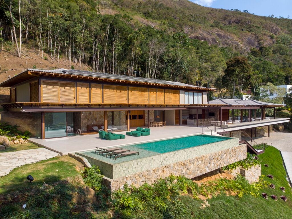 Implantada em um terreno de 10 mil m² na serra de Itaipava, distrito de Petrópolis (RJ), esta casa de campo desenha um encontro harmonioso entre arquitetura e natureza. Assinada pelos arquitetos Maurício Magarão e Alice Lindenberg, do escritório Magarão + Lindenberg Arquitetura (@magarao_lindenberg_arq), a residência nasceu do desafio de adaptar um programa extenso de 1.200 m² a um lote bastante íngreme, preservando a paisagem e promovendo integração total entre os espaços.