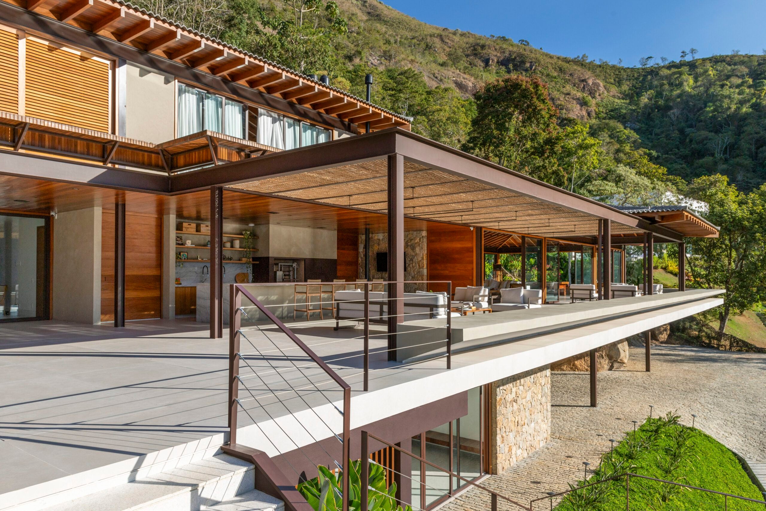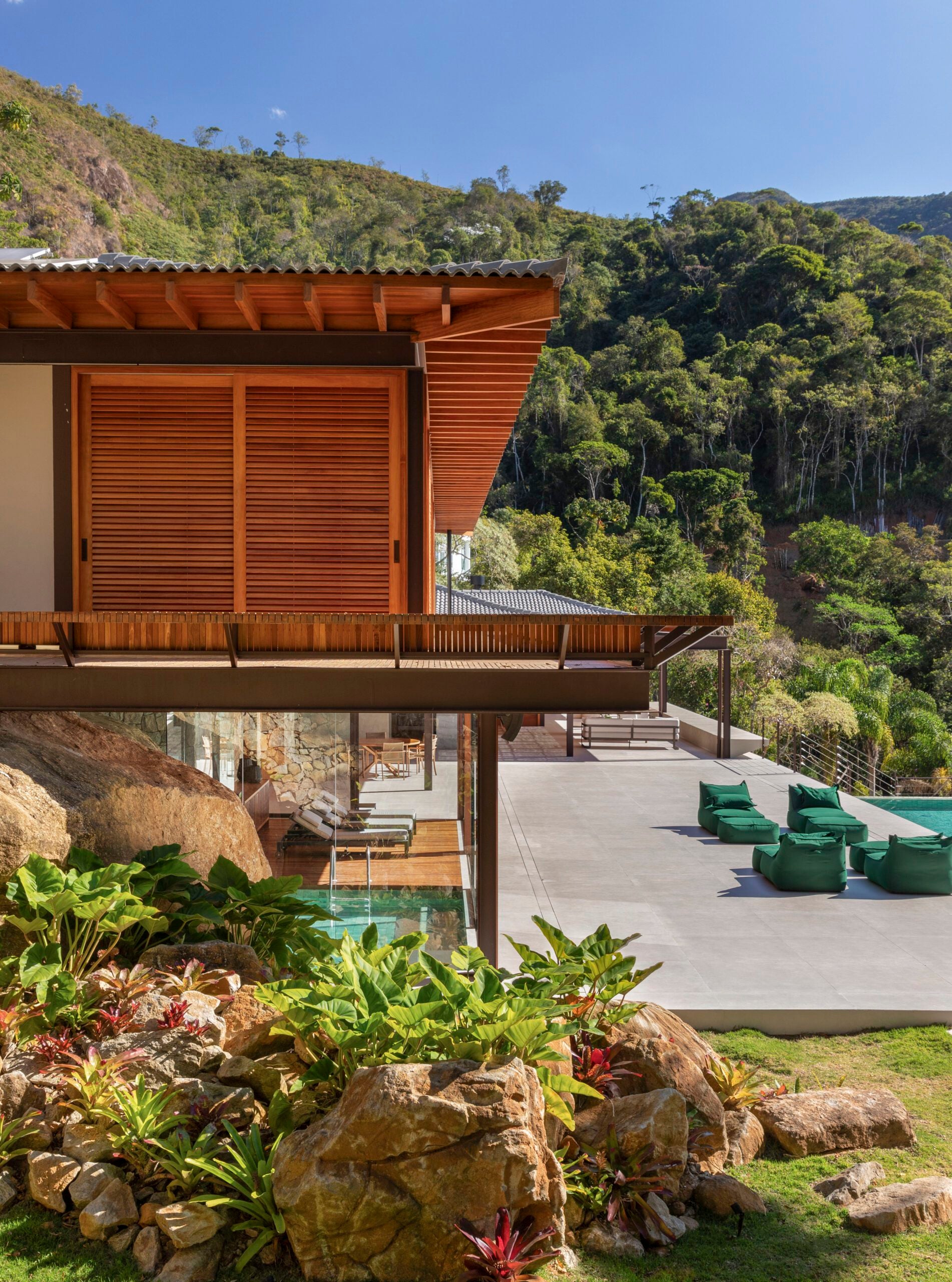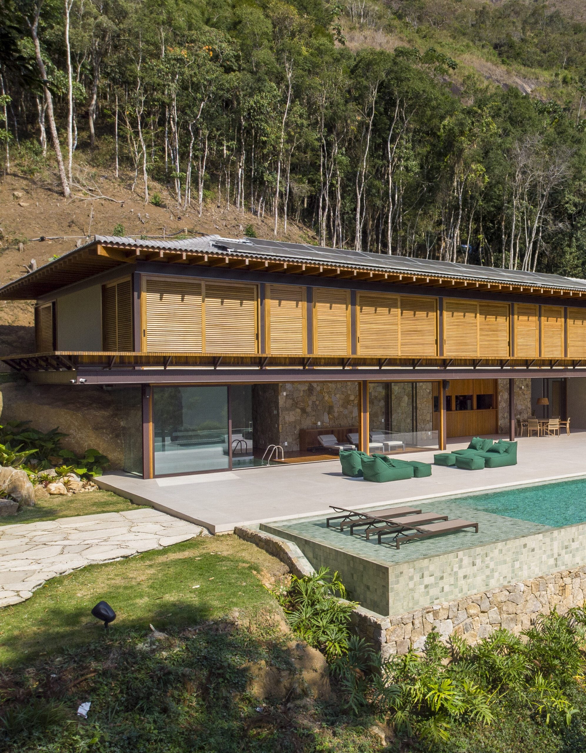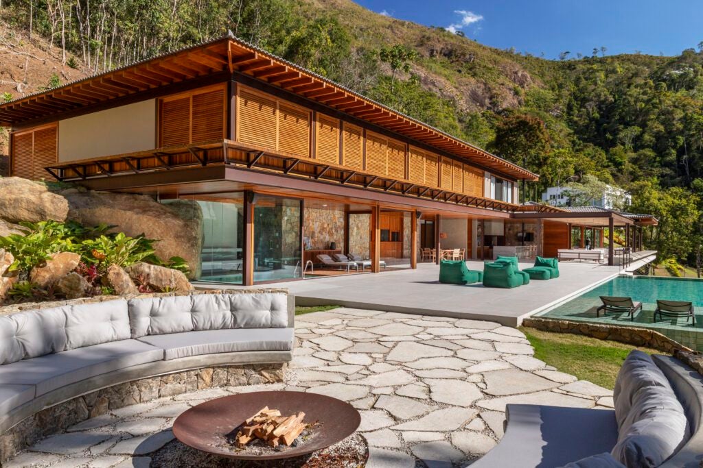 Implantada em um terreno de 10 mil m² na serra de Itaipava, distrito de Petrópolis (RJ), esta casa de campo desenha um encontro harmonioso entre arquitetura e natureza. Assinada pelos arquitetos Maurício Magarão e Alice Lindenberg, do escritório Magarão + Lindenberg Arquitetura (@magarao_lindenberg_arq), a residência nasceu do desafio de adaptar um programa extenso de 1.200 m² a um lote bastante íngreme, preservando a paisagem e promovendo integração total entre os espaços.