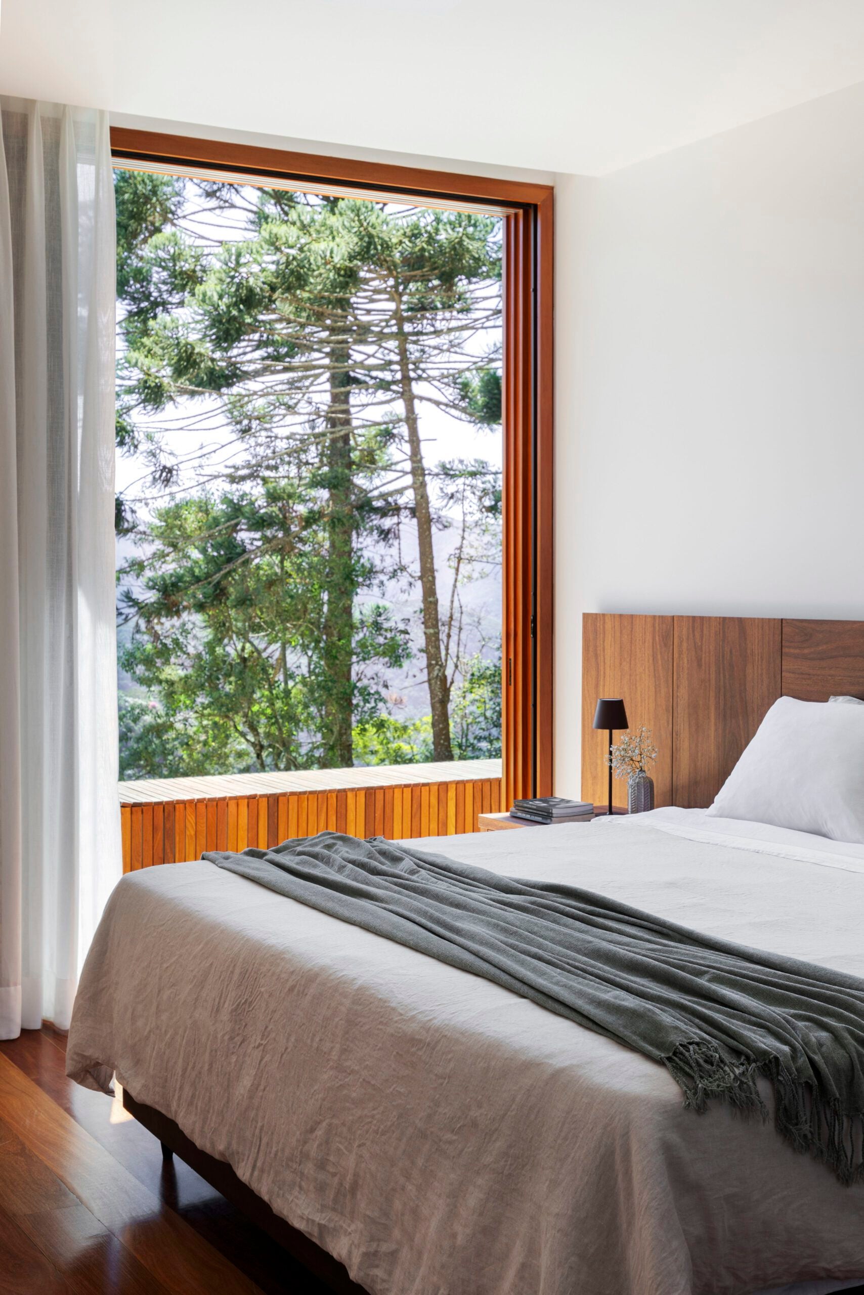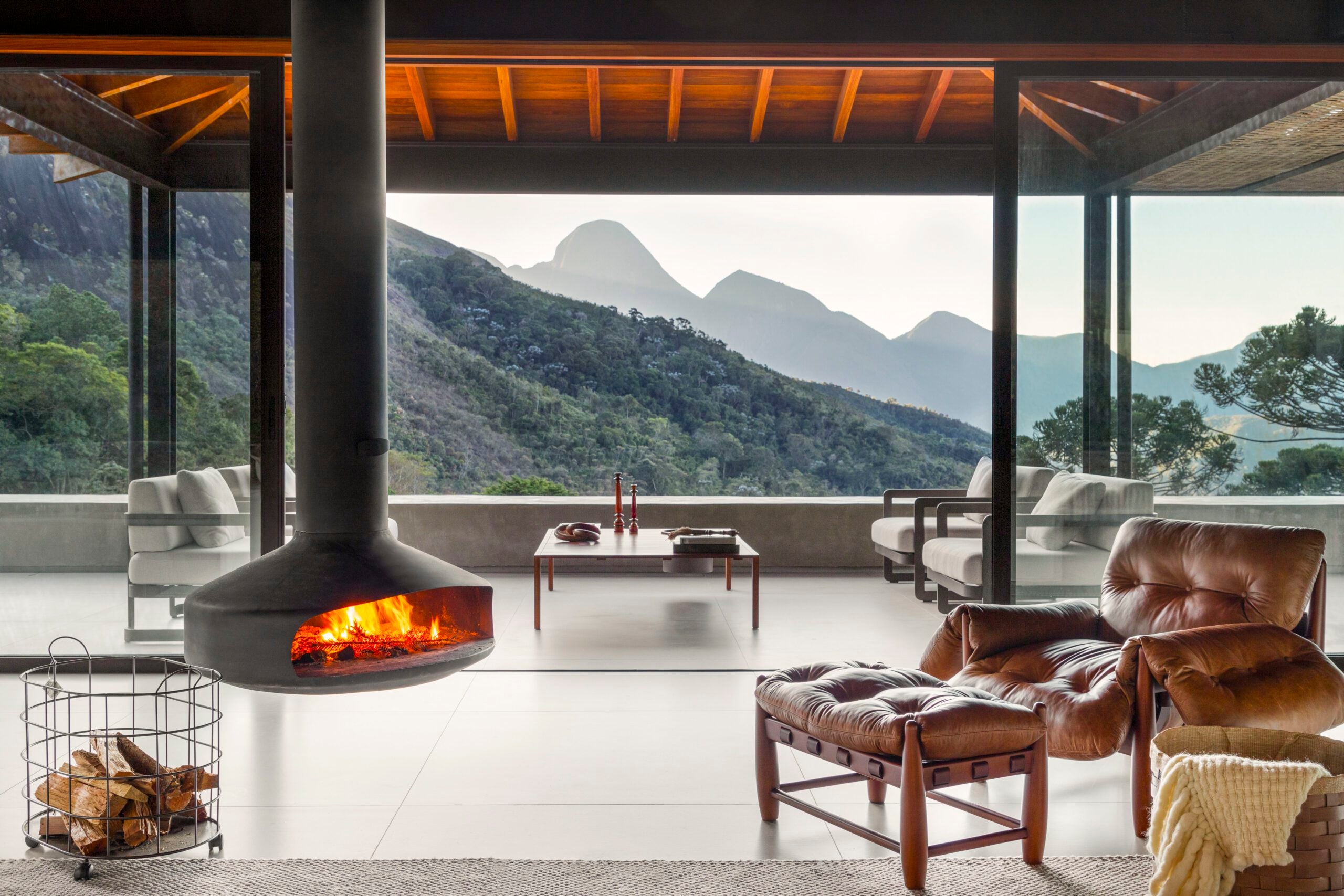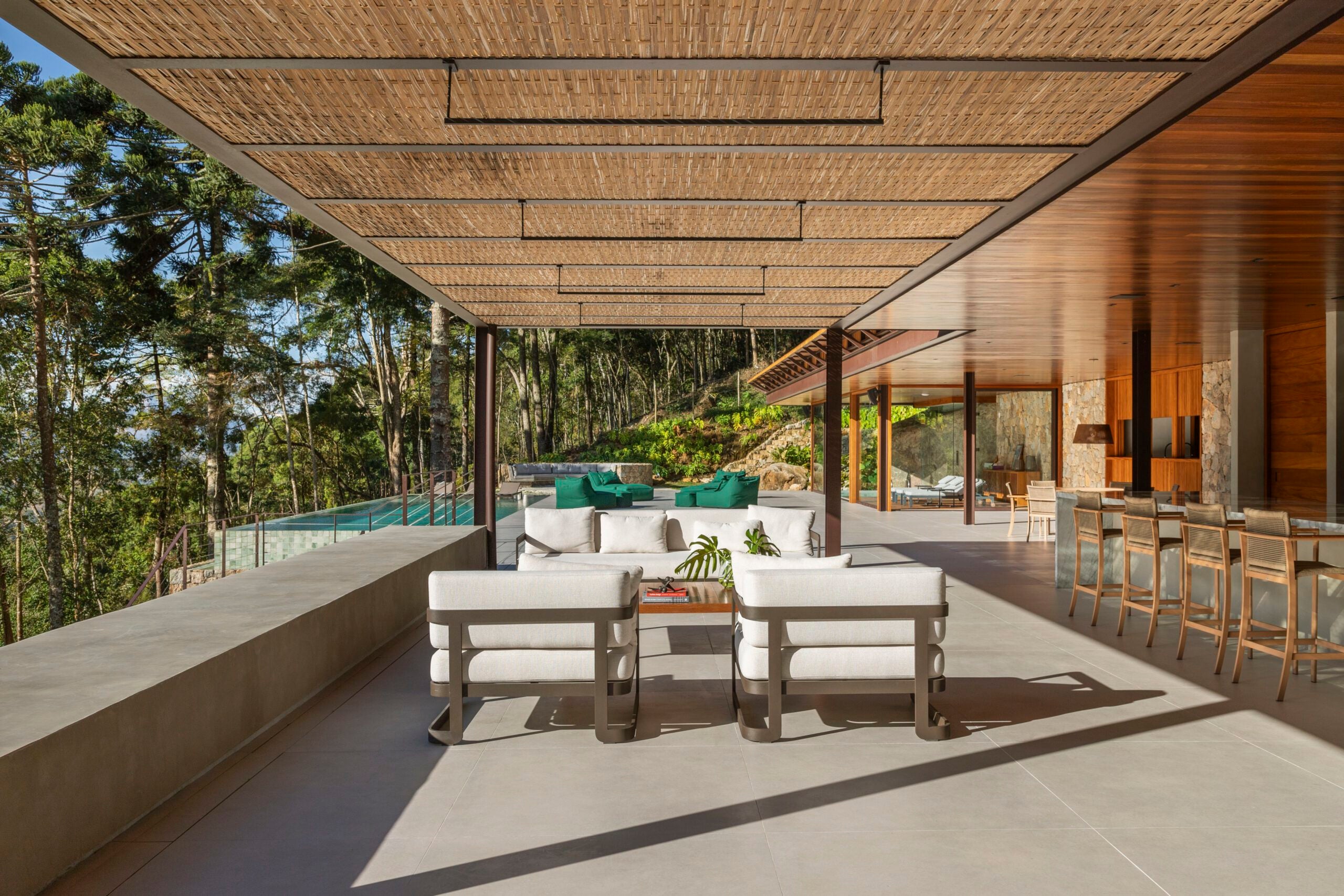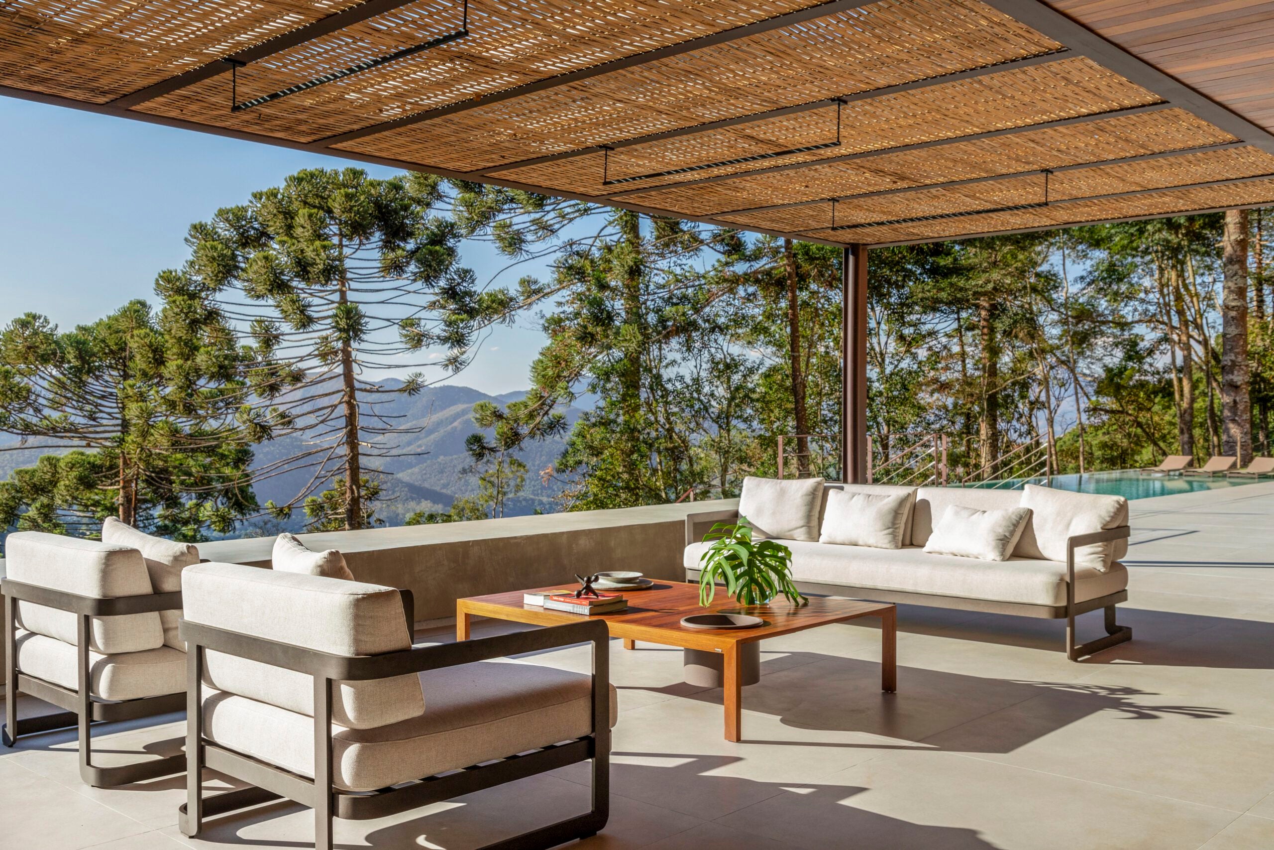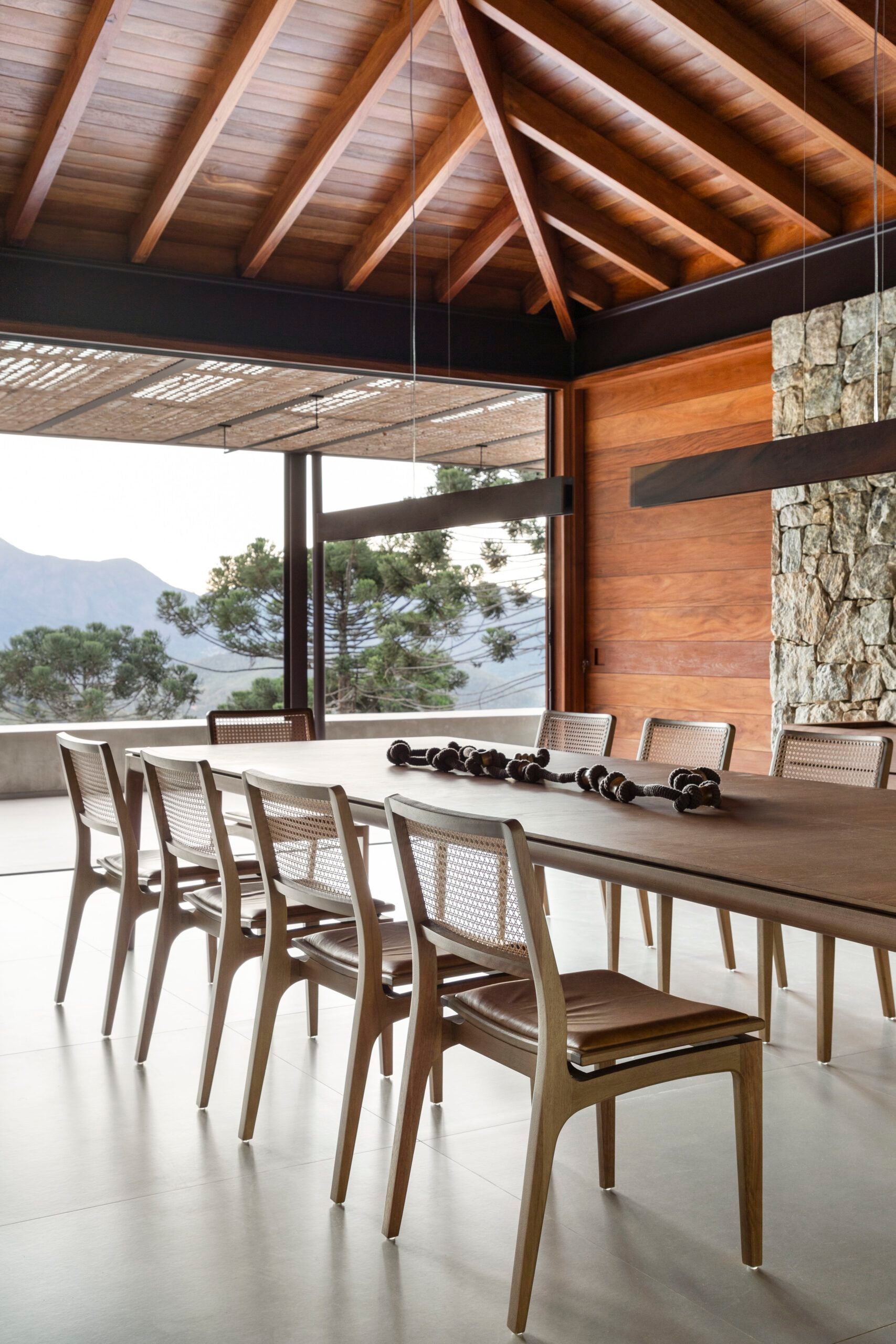 A materialidade reforça o espírito de casa de serra. As pedras retiradas do terreno se misturam a diferentes tipos de madeira e ao forro em palha de dendê trançada, que filtra a luz natural e cria uma sensação acolhedora. Na área externa, a lareira em aço Corten e concreto convida ao convívio em meio às araucárias, um espaço de contemplação e pausa que traduz o verdadeiro propósito deste refúgio.