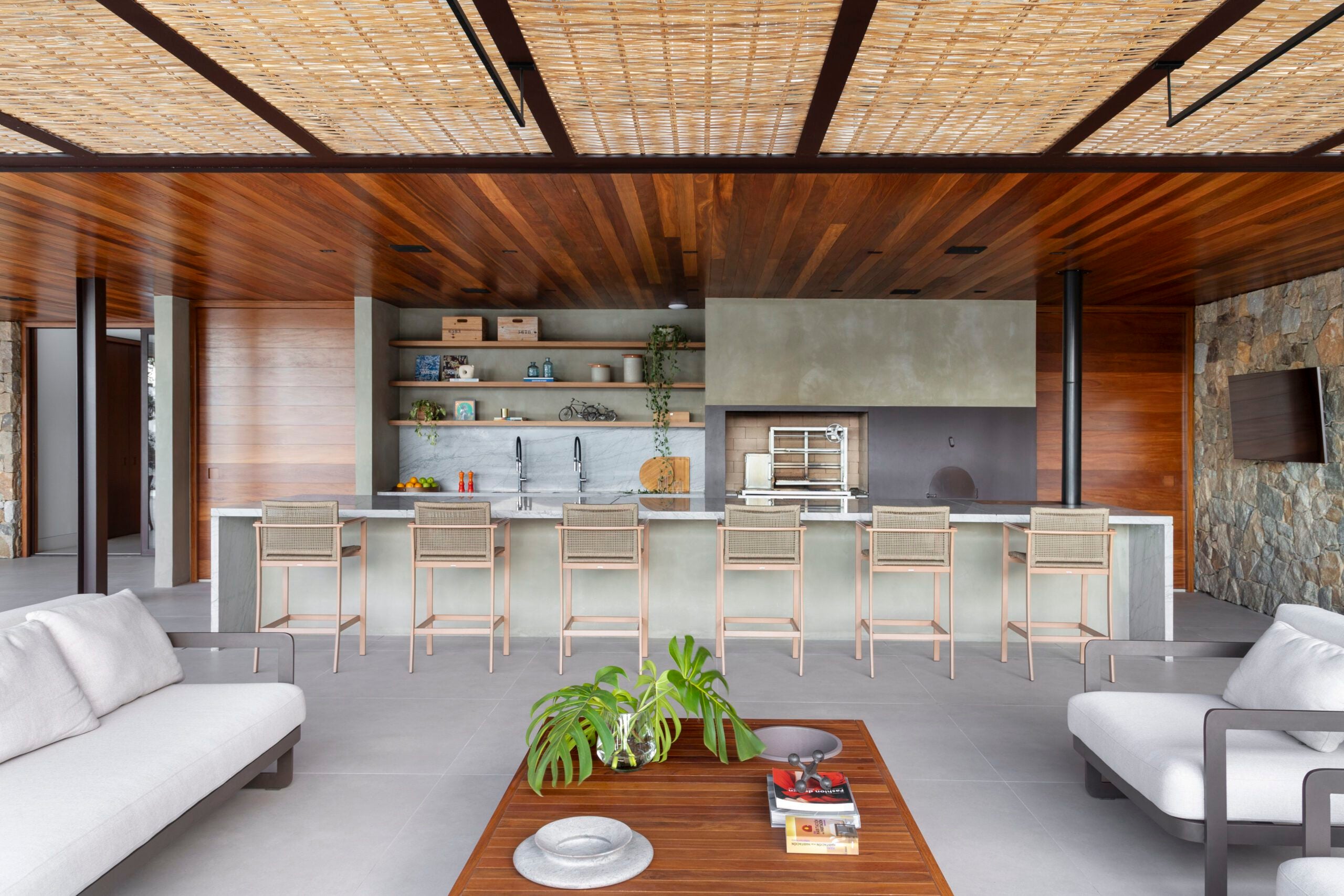 Pensada como um refúgio de fim de semana para reunir uma grande família, a casa abriga pais, três irmãos, cônjuges e filhos. O projeto valoriza o convívio, o esporte e o contato com o verde. Quadra de tênis, beach tennis e amplas áreas de lazer ao ar livre convivem com uma área gourmet generosa, o verdadeiro coração da casa, onde os anfitriões se reúnem para cozinhar e celebrar.