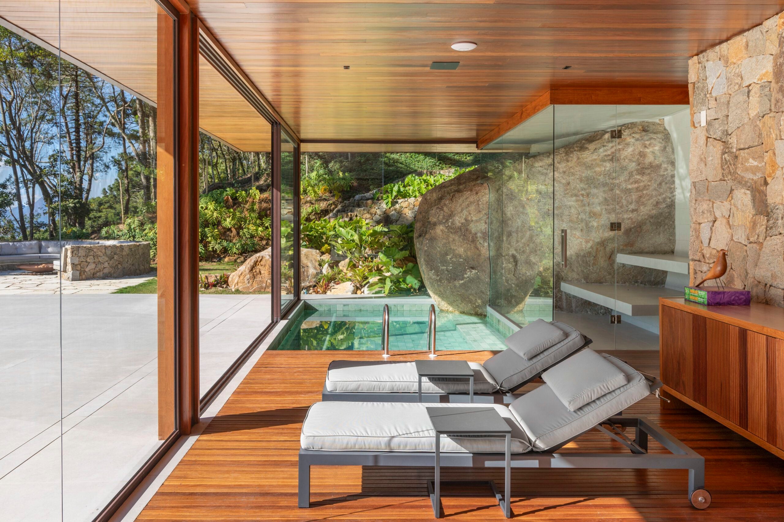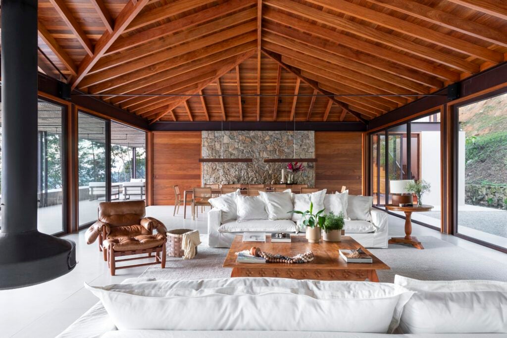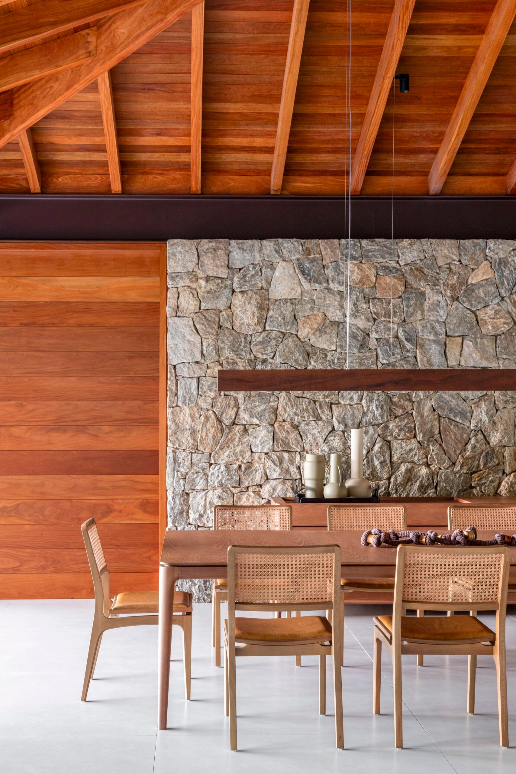 Nos interiores, também concebidos pelo escritório, a neutralidade domina. A paleta leve e natural cria a atmosfera ideal para descanso e convivência, equilibrando móveis de família com novas peças de design. Entre os destaques, a icônica poltrona Mole, de Sergio Rodrigues, e a mesa de jantar com buffet da Ovoo compõem o cenário com elegância discreta, contrastando com as texturas da pedra e da madeira.