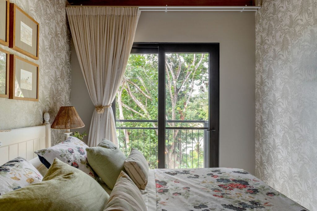 Na suíte do casal, o papel de parede tropical dialoga com a leveza das cortinas em linho neutro.