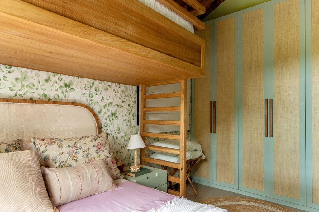 Na suíte da filha, o beliche de madeira maciça sobre a cama de casal, feito em louro freijó pela MN Armários, aproveita o pé-direito alto e transforma o espaço em um ambiente versátil para hóspedes.