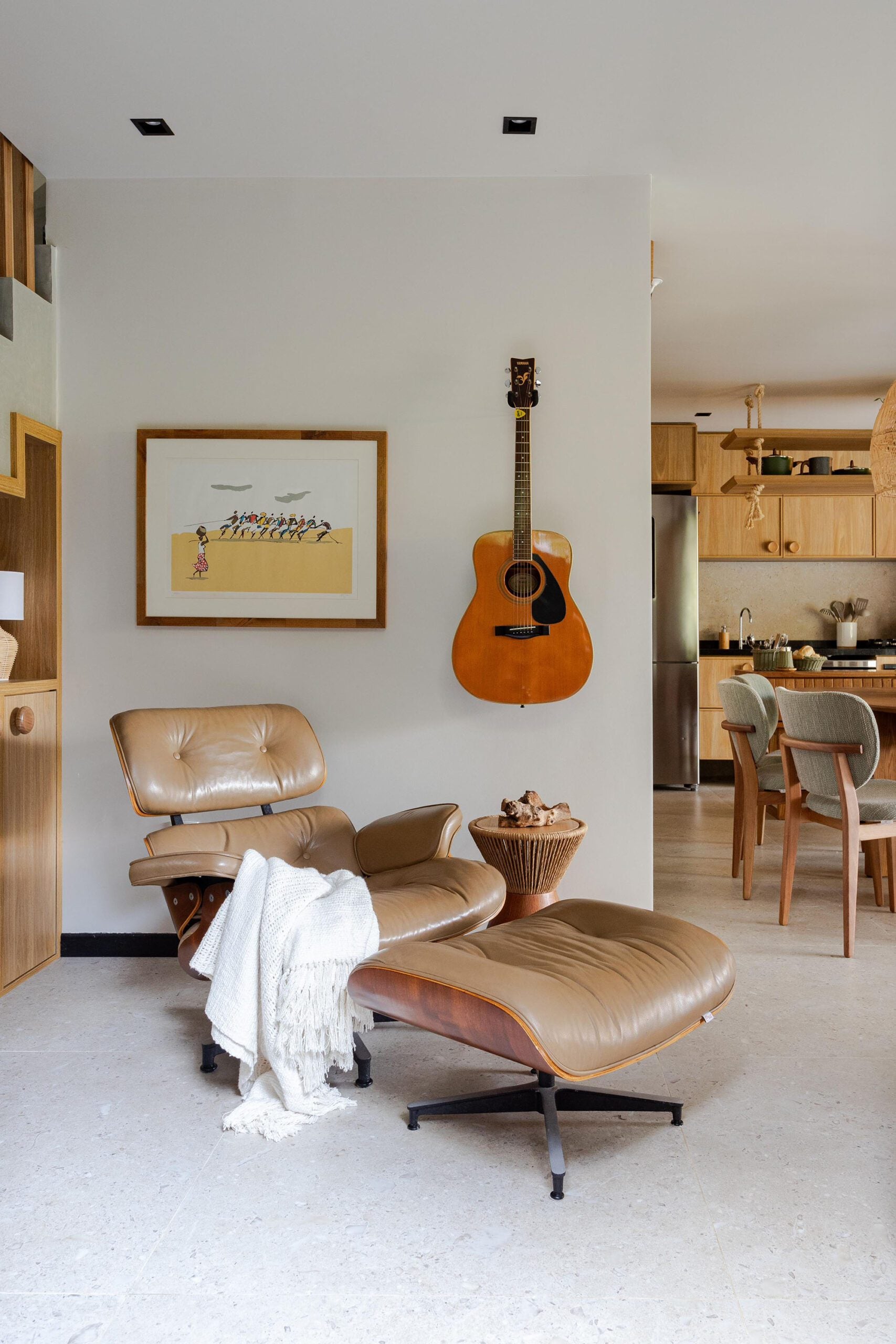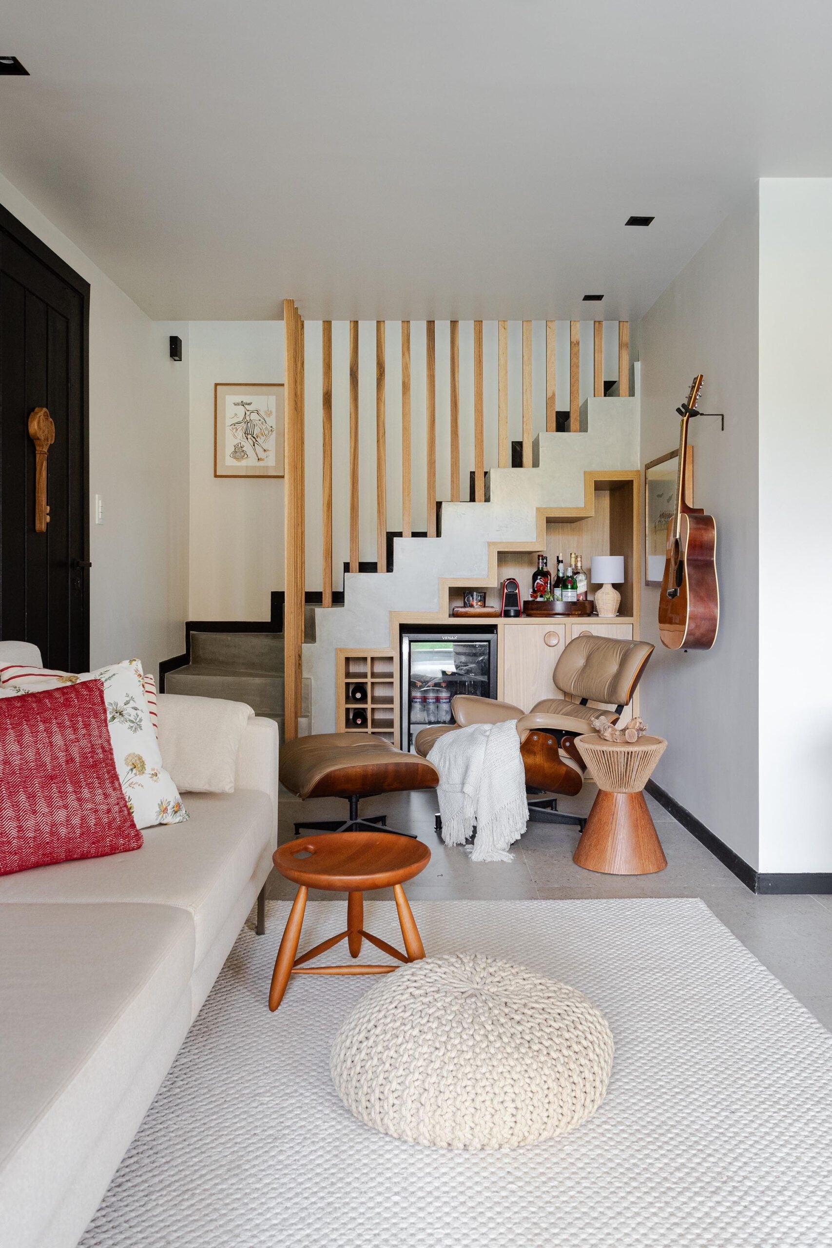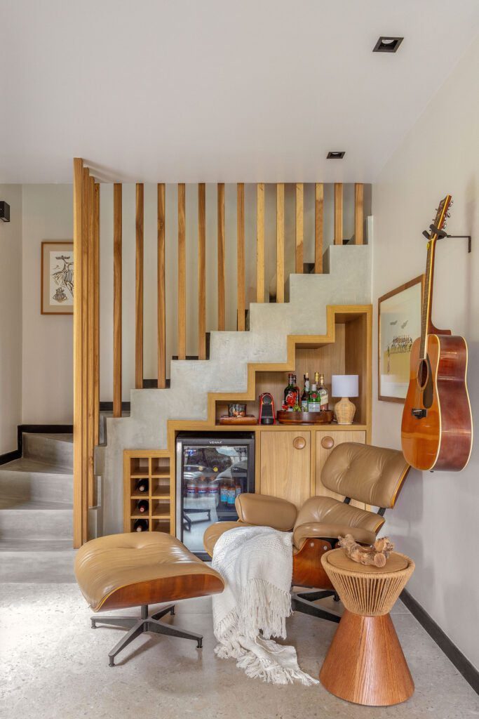 No mobiliário, peças da Tidelli equipam a área externa, enquanto móveis da Domi Interiores adornam a sala de estar e a cozinha. A poltrona Charles Eames, o sofá da sala de TV e outros itens de acervo pessoal também compõem o ambiente.