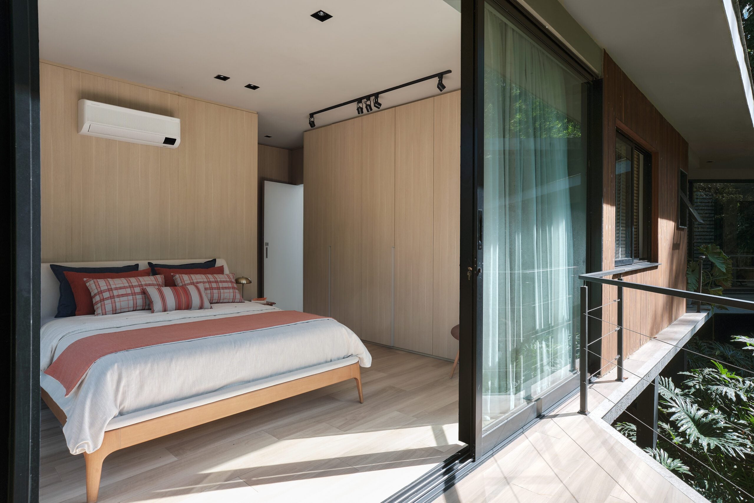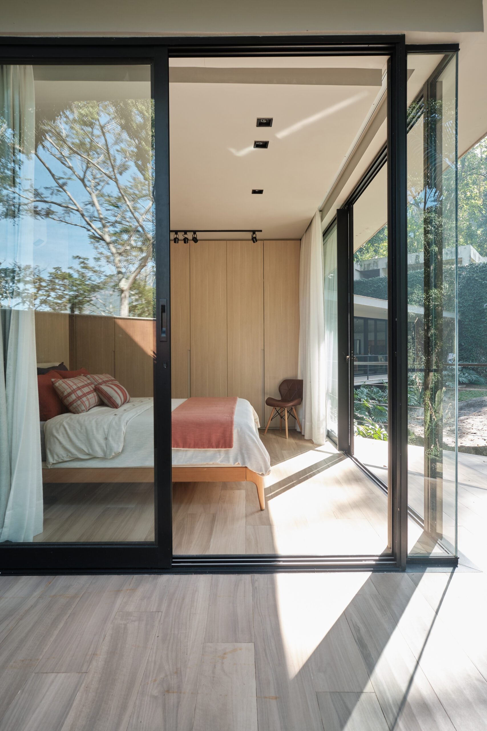 A suíte do casal ocupa o último ambiente da casa e se abre para o riacho com uma varanda totalmente revestida em madeira. Já as crianças ganharam uma suíte canadense: um menino de 8 anos e a bebê dividem o banheiro, que também atende como lavabo social. Um anexo já existente no terreno foi incorporado como área de serviço, com lavanderia, depósito e acesso interno. A área gourmet, por sua vez, foi criada abaixo da suíte principal, aproveitando o declive do terreno e reforçando a integração entre volumes e cotas naturais.