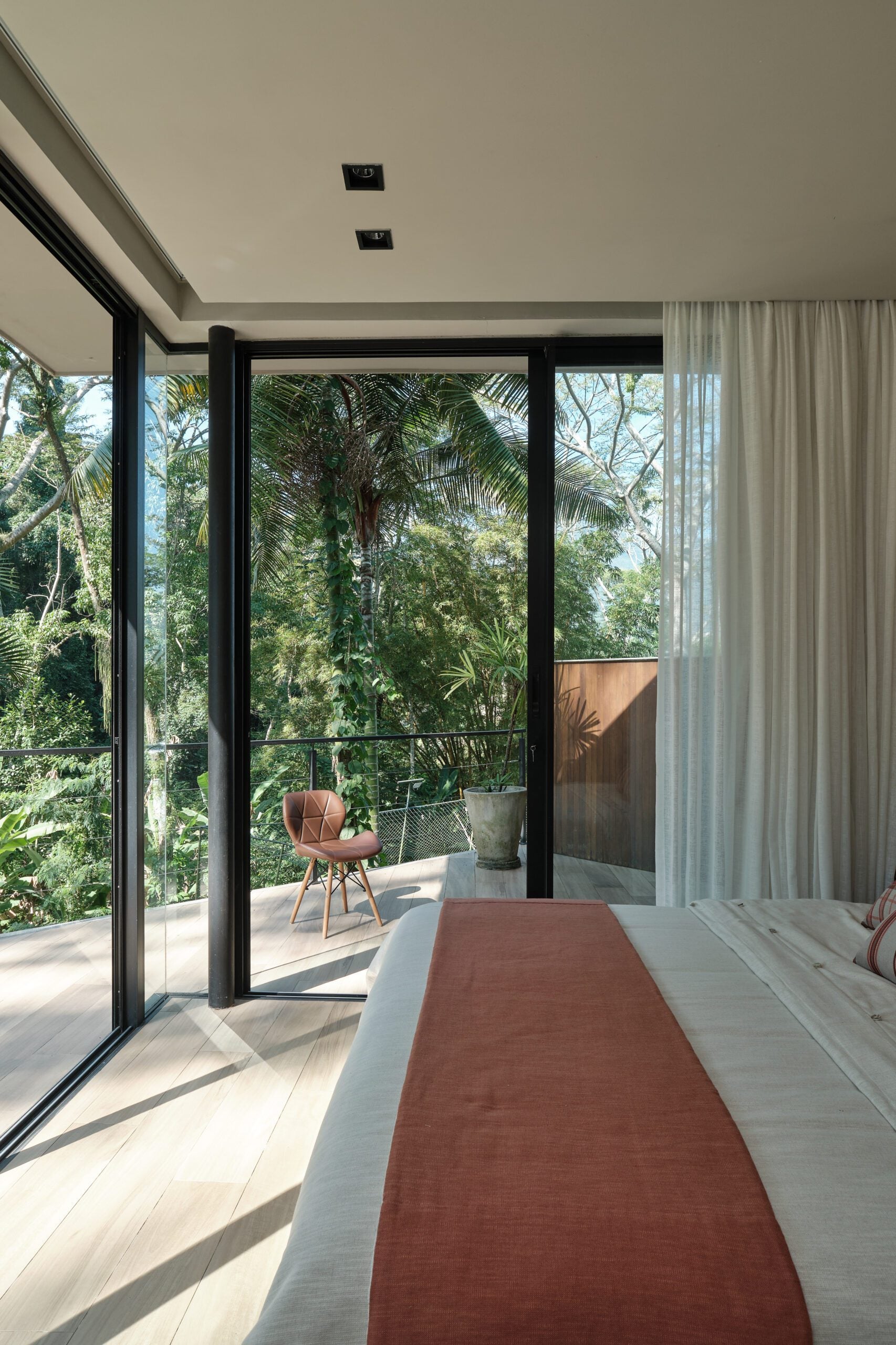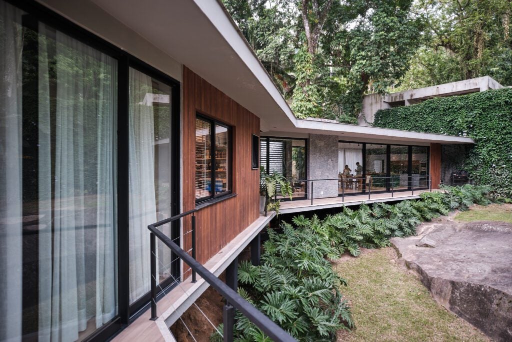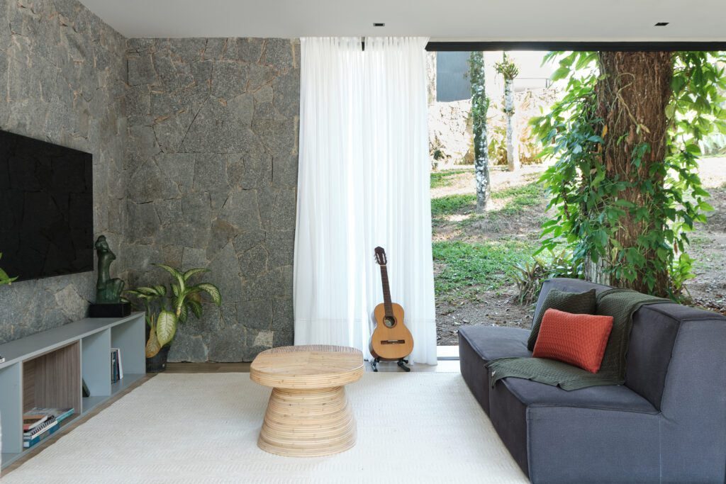 Entre os volumes social e íntimo, uma árvore existente no terreno foi preservada e tornou-se protagonista da transição. Esse cuidado com o entorno se repete em toda a obra. Na varanda posterior, por exemplo, o espaço se conecta diretamente a um paredão verde e a uma grande rocha, integrando a paisagem à arquitetura de forma quase poética.