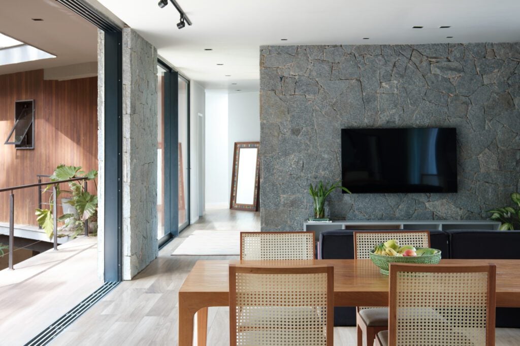 A natureza, como reforçam os arquitetos, é o eixo do projeto e sua protagonista. Pedra, madeira e paisagismo exuberante aparecem não apenas como escolhas estéticas, mas como experiência sensorial e afetiva para os moradores. Esse equilíbrio entre arquitetura e entorno chamou atenção também do mercado audiovisual. A casa já foi cenário de produções publicitárias e até de novela, mas segue sendo, antes de tudo, o refúgio íntimo e dos sonhos da família que a habita.