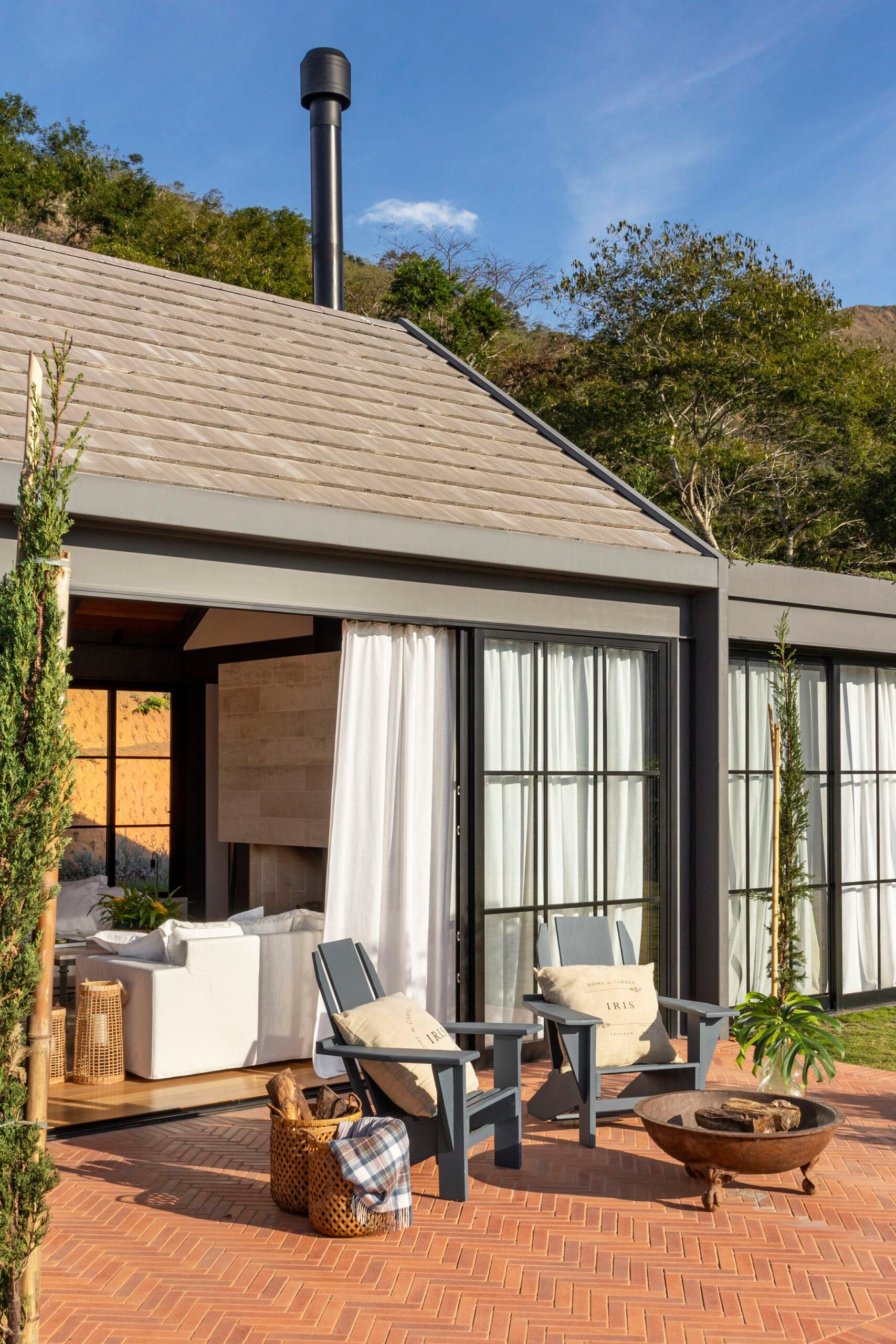Na decoração, predominam peças do acervo dos clientes, como móveis, adornos e obras de arte. A paleta neutra e clara das paredes brancas e do chão cinza foi escolhida para destacar os itens coloridos do acervo. Já os espaços externos seguem tons terrosos e naturais, em sintonia com a vegetação ao redor.