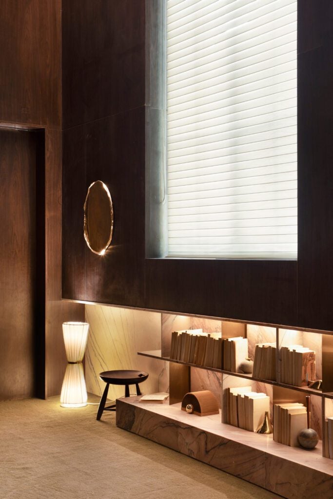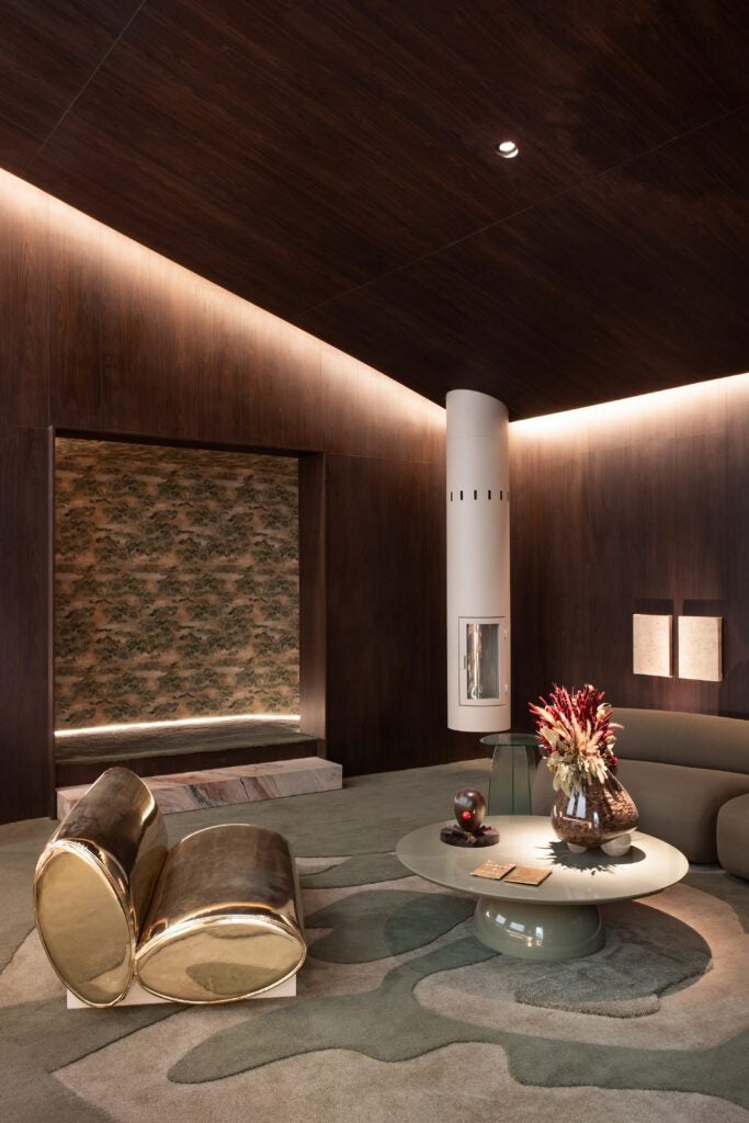 As formas orgânicas do sofá, da mesa de centro e da lareira esculpida reforçam a presença da natureza. Ao centro, a poltrona dourada simboliza a luz. A estante em mármore branco sob as janelas e as peças de design assinado equilibram sofisticação e calma.