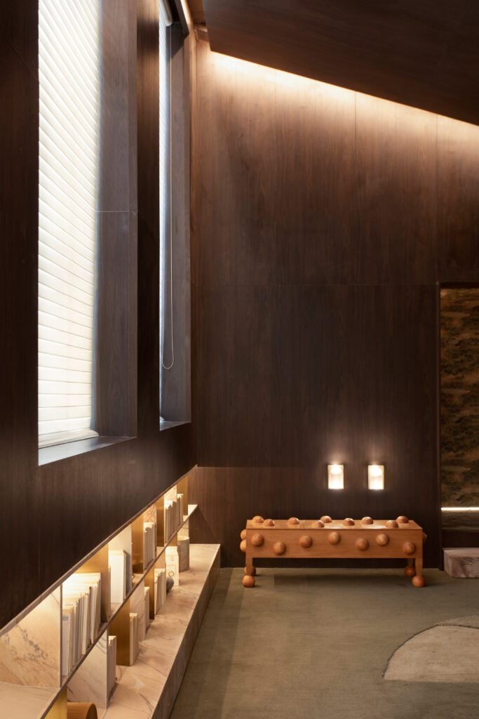 O ambiente principal se abre como uma clareira. A luz entra suavemente pelas janelas e se espalha por paredes de madeira nogueira. O teto inclinado de madeira conduz o olhar para cima, criando amplitude.