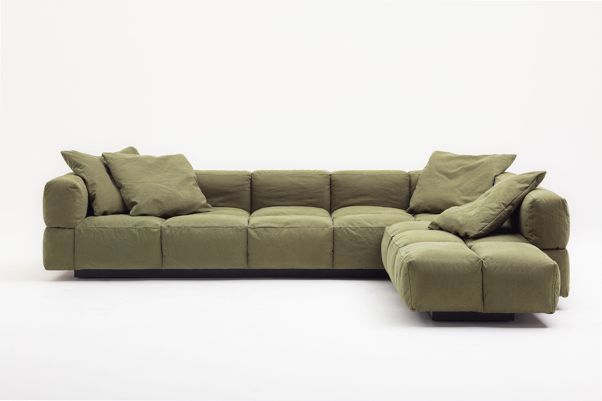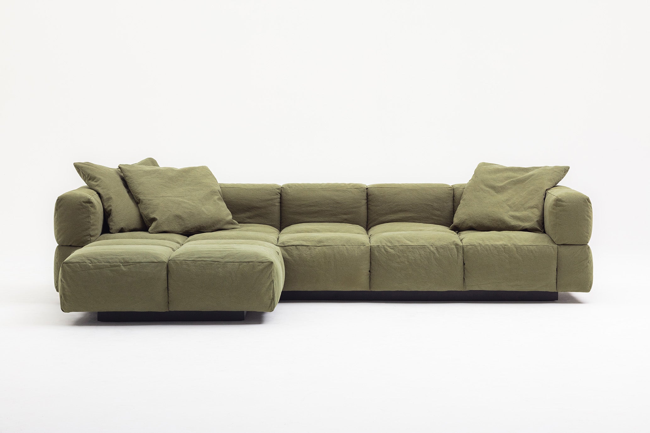 O sofá modular Luva, da Herman Miller em parceria com Gabriel Tan, é versátil, com visual atraente e acolhedor. A inspiração foi o punho macio e o suporte acolchoado das luvas de boxe, assim como os delicados topos enrolados dos futons japoneses. O resultado é uma forma distinta e visualmente suave, com linhas orgânicas. A parte de trás do sofá pode ser ampliada, permitindo uma postura relaxada.
