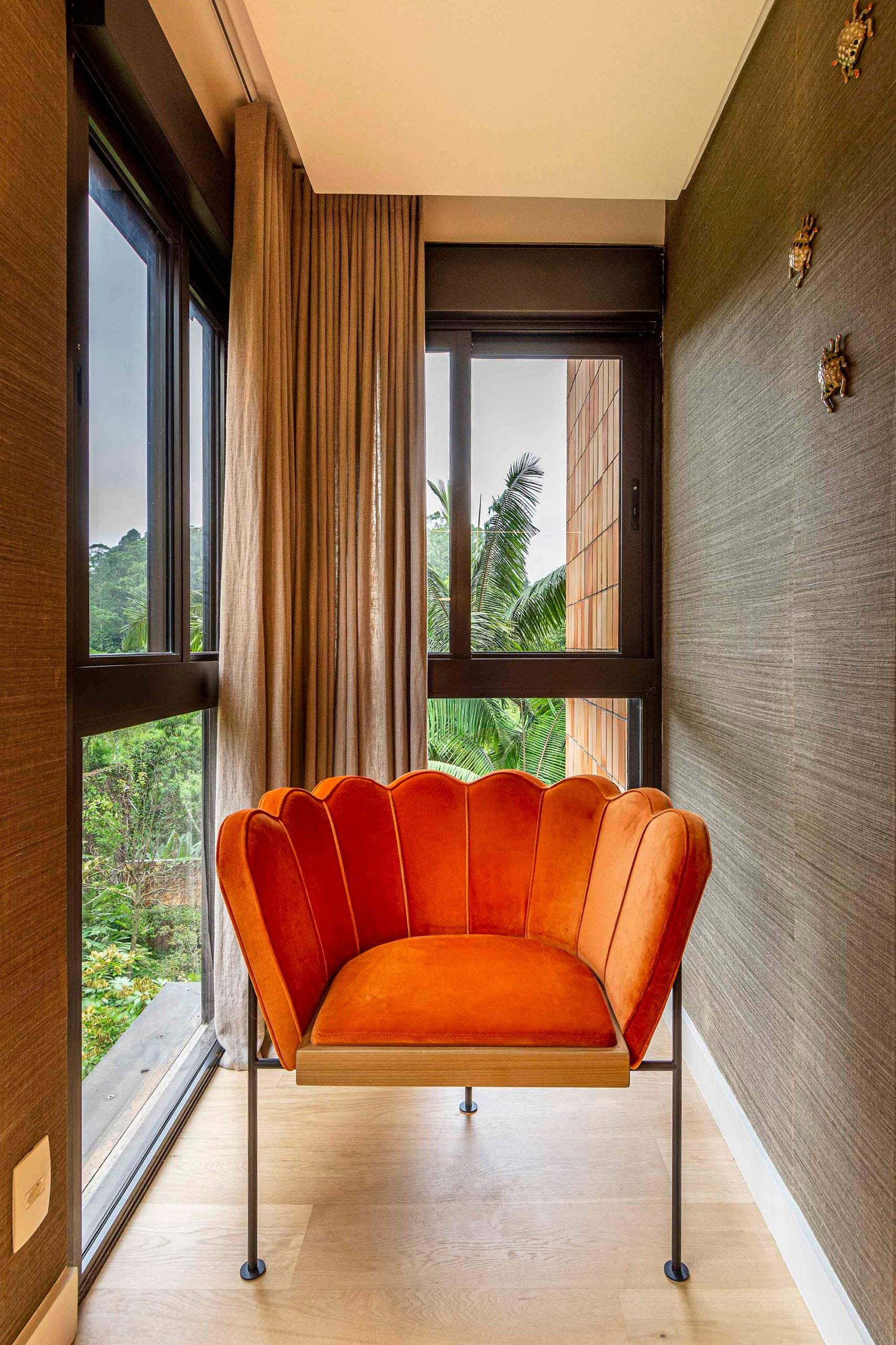 Na varanda íntima, uma cadeira do Atelier Gustavo Bittencourt, revestida em um luxuoso veludo laranja, convida os moradores a desfrutarem de momentos contemplativos ao ar livre.