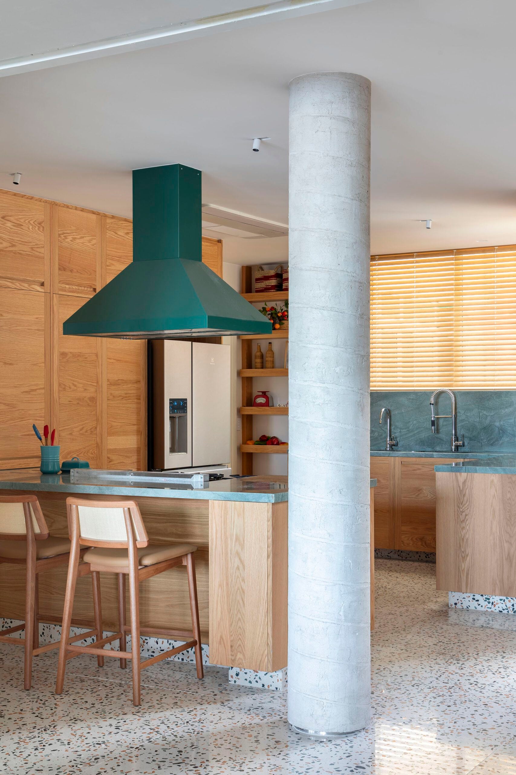 O piso de granilite com tons de verde e azul dá personalidade à cozinha integrada, que conta com bancada generosa para o preparo das refeições e armários planejados que organizam os utensílios sem interferir na estética.