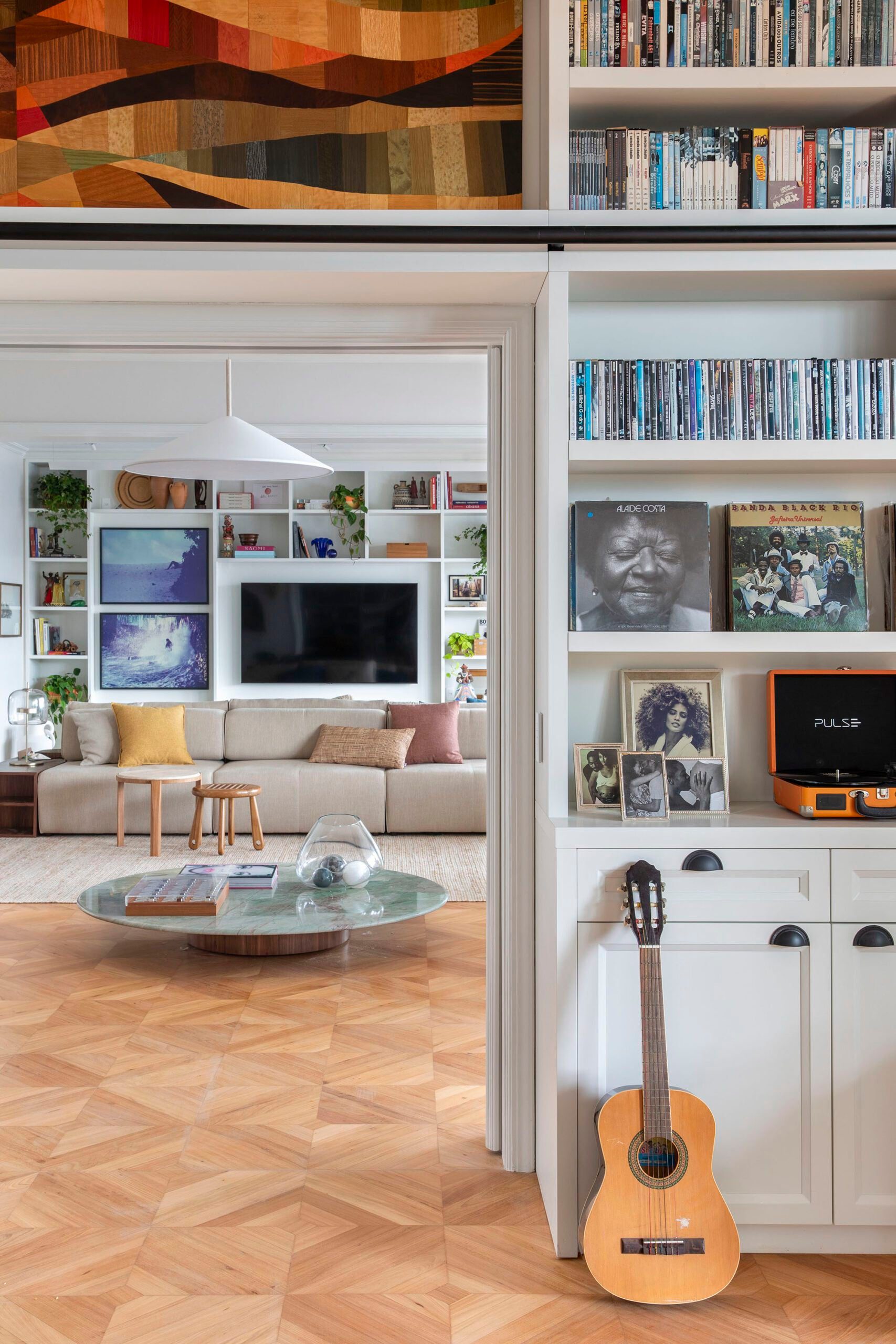 Estantes abertas acomodam livros, objetos pessoais e memórias afetivas do casal.